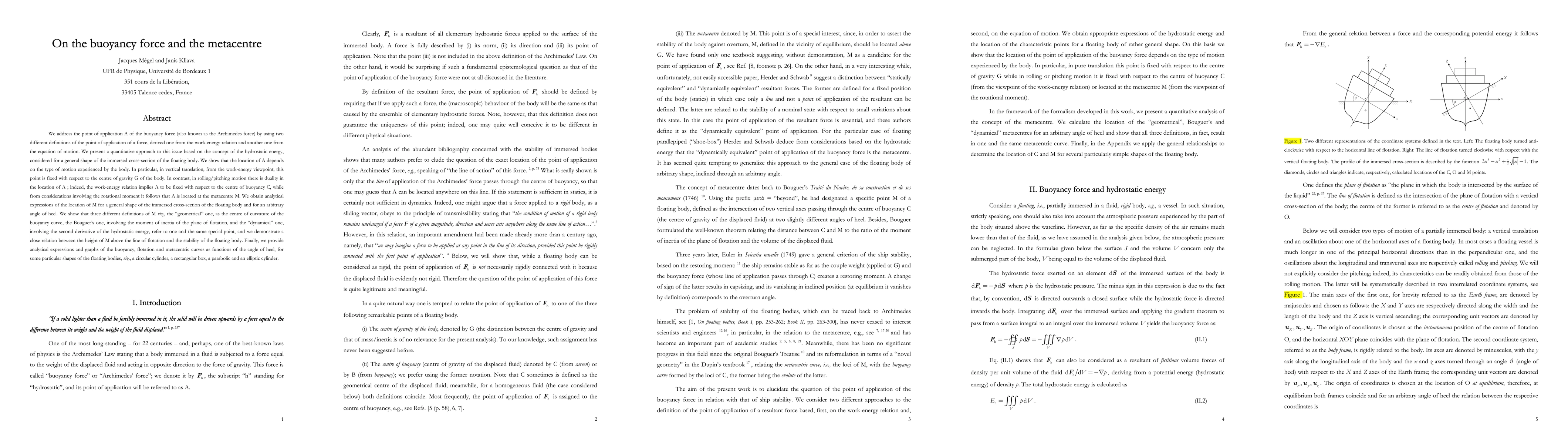 We address the point of application A of the buoyancy force (also known as the Archimedes force) by using two different definitions of the point of application of a force, derived one from the work-energy relation and another one from the equation of motion. We present a quantitative approach to this issue based on the concept of the hydrostatic energy, considered for a general shape of the immersed cross-section of the floating body. We show that the location of A depends on the type of motion experienced by the body. In particular, in vertical translation, from the work-energy viewpoint, this point is fixed with respect to the centre of gravity G of the body. In contrast, in rolling/pitching motion there is duality in the location of A ; indeed, the work-energy relation implies A to be fixed with respect to the centre of buoyancy C, while from considerations involving the rotational moment it follows that A is located at the metacentre M. We obtain analytical expressions of the location of M for a general shape of the immersed cross-section of the floating body and for an arbitrary angle of heel. We show that three different definitions of M viz., the ?geometrical? one, as the centre of curvature of the buoyancy curve, the Bouguer's one, involving the moment of inertia of the plane of flotation, and the ?dynamical? one, involving the second derivative of the hydrostatic energy, refer to one and the same special point, and we demonstrate a close relation between the height of M above the line of flotation and the stability of the floating body. Finally, we provide analytical expressions and graphs of the buoyancy, flotation and metacentric curves as functions of the angle of heel, for some particular shapes of the floating bodies.