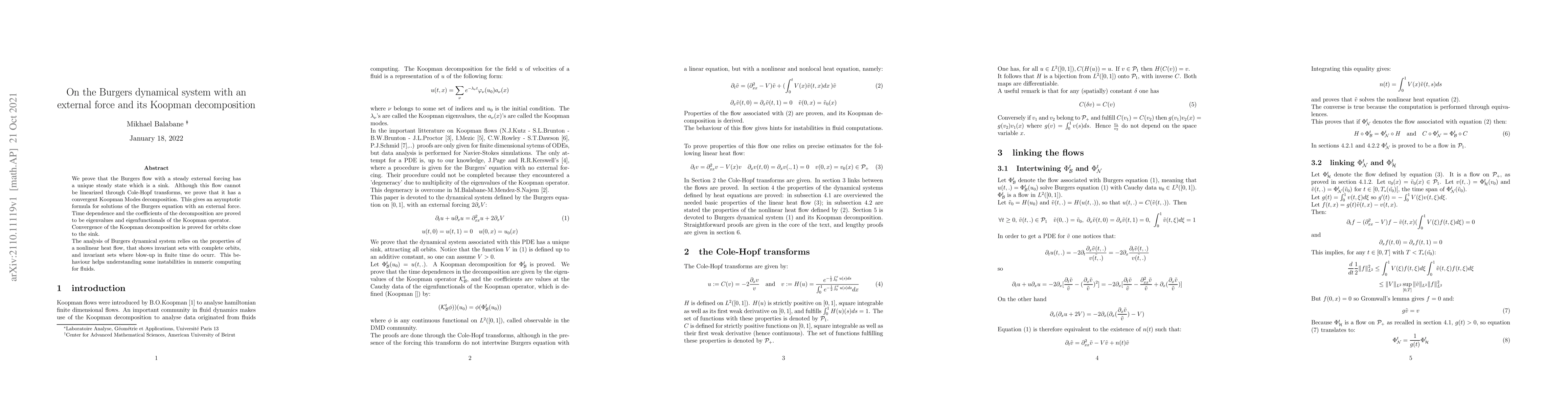 We prove that the Burgers flow with a steady external forcing has a unique steady state which is a sink. Although this flow cannot be linearized through Cole-Hopf transforms, we prove that it has a convergent Koopman Modes decomposition. This gives an asymptotic formula for solutions of the Burgers equation with an external force. Time dependence and the coefficients of the decomposition are proved to be eigenvalues and eigenfunctionals of the Koopman operator. Convergence of the Koopman decomposition is proved for orbits close to the sink. The analysis of Burgers dynamical system relies on the properties of a nonlinear heat flow, that shows invariant sets with complete orbits, and invariant sets where blow-up in finite time do ocurr. This behaviour helps understanding some instabilities in numeric computing for fluids.