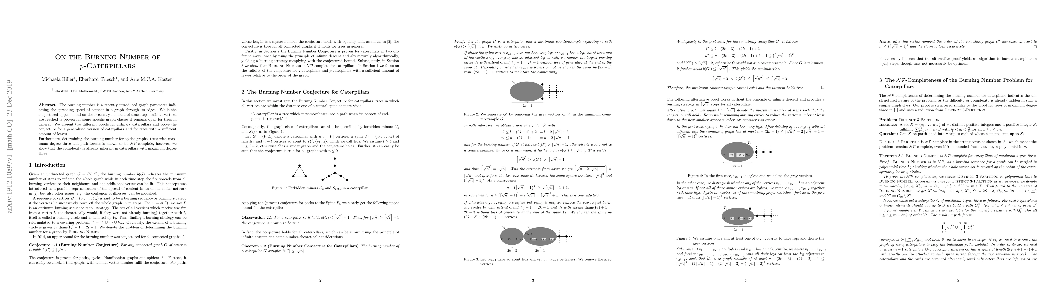 This paper explores the burning number, a measure of content spread in graphs, proving the conjecture for ordinary caterpillars and generalized caterpillars, while highlighting the $\mathcal{NP}$-completeness of determining the burning number for certain graph types, including those with maximum degree three.