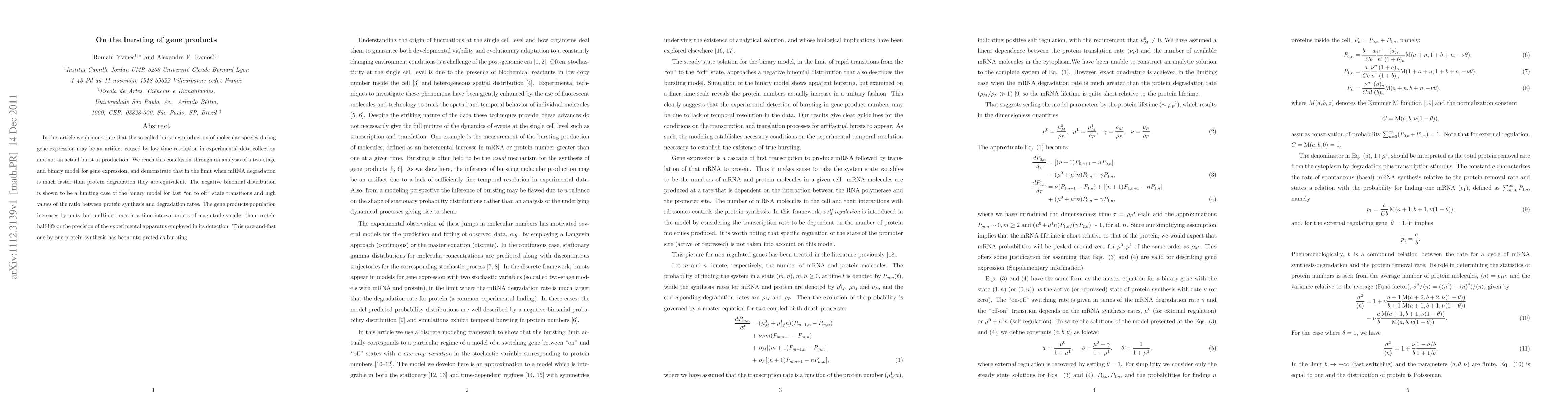 In this article we demonstrate that the so-called bursting production of molecular species during gene expression may be an artifact caused by low time resolution in experimental data collection and not an actual burst in production. We reach this conclusion through an analysis of a two-stage and binary model for gene expression, and demonstrate that in the limit when mRNA degradation is much faster than protein degradation they are equivalent. The negative binomial distribution is shown to be a limiting case of the binary model for fast "on to off" state transitions and high values of the ratio between protein synthesis and degradation rates. The gene products population increases by unity but multiple times in a time interval orders of magnitude smaller than protein half-life or the precision of the experimental apparatus employed in its detection. This rare-and-fast one-by-one protein synthesis has been interpreted as bursting.
