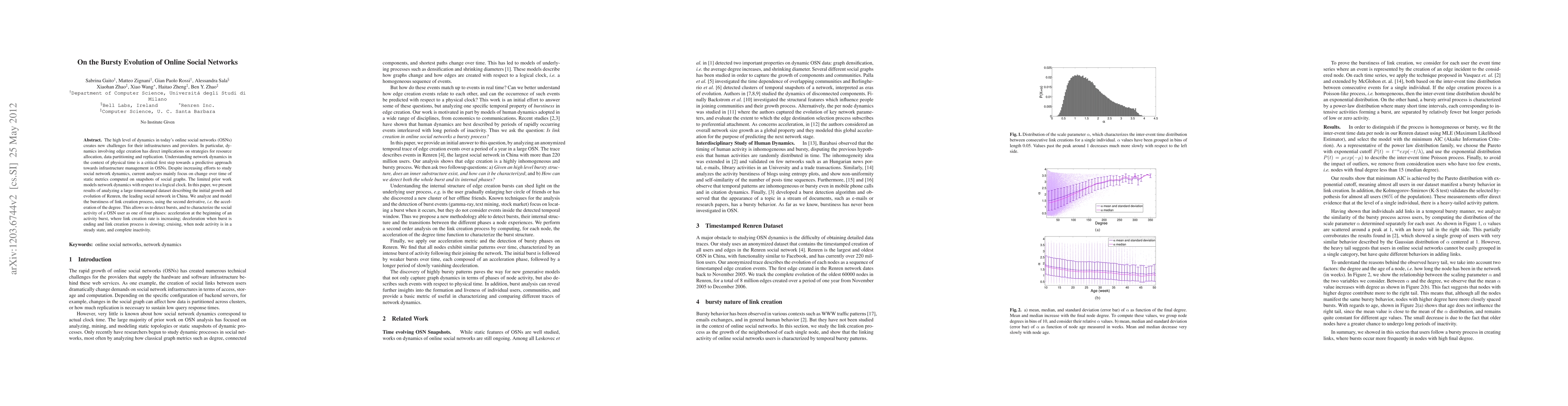 The high level of dynamics in today's online social networks (OSNs) creates new challenges for their infrastructures and providers. In particular, dynamics involving edge creation has direct implications on strategies for resource allocation, data partitioning and replication. Understanding network dynamics in the context of physical time is a critical first step towards a predictive approach towards infrastructure management in OSNs. Despite increasing efforts to study social network dynamics, current analyses mainly focus on change over time of static metrics computed on snapshots of social graphs. The limited prior work models network dynamics with respect to a logical clock. In this paper, we present results of analyzing a large timestamped dataset describing the initial growth and evolution of Renren, the leading social network in China. We analyze and model the burstiness of link creation process, using the second derivative, i.e. the acceleration of the degree. This allows us to detect bursts, and to characterize the social activity of a OSN user as one of four phases: acceleration at the beginning of an activity burst, where link creation rate is increasing; deceleration when burst is ending and link creation process is slowing; cruising, when node activity is in a steady state, and complete inactivity.