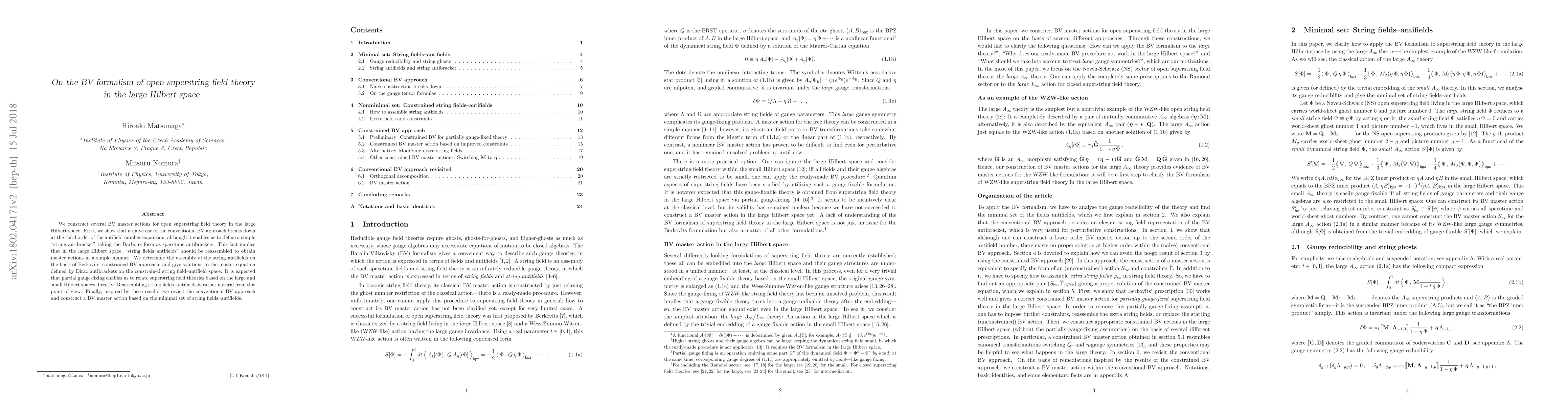 We construct several BV master actions for open superstring field theory in the large Hilbert space. First, we show that a naive use of the conventional BV approach breaks down at the third order of the antifield number expansion, although it enables us to define a simple "string antibracket" taking the Darboux form as space-time antibrackets. This fact implies that in the large Hilbert space, "string fields-antifields" should be reassembled to obtain master actions in a simple manner. We determine the assembly of the string antifields on the basis of Berkovits' constrained BV approach, and give solutions to the master equation defined by Dirac antibrackets on the constrained string field-antifield space. It is expected that partially gauge-fixing enables us to relate superstring field theories based on the large and small Hilbert spaces directly: Reassembling string fields-antifields is rather natural from this point of view. Finally, inspired by these results, we revisit the conventional BV approach and construct a BV master action based on the minimal set of string fields-antifields.