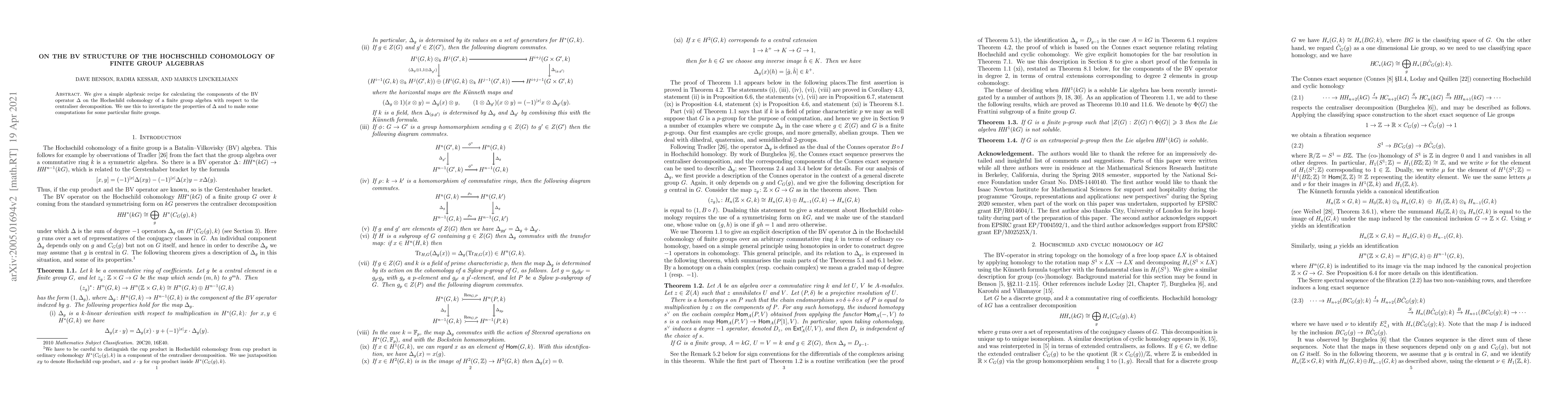 This paper presents an algebraic method to compute the components of the BV operator on the Hochschild cohomology of finite group algebras via centralizer decomposition, and uses this approach to study the operator's properties and perform specific calculations for select finite groups.
