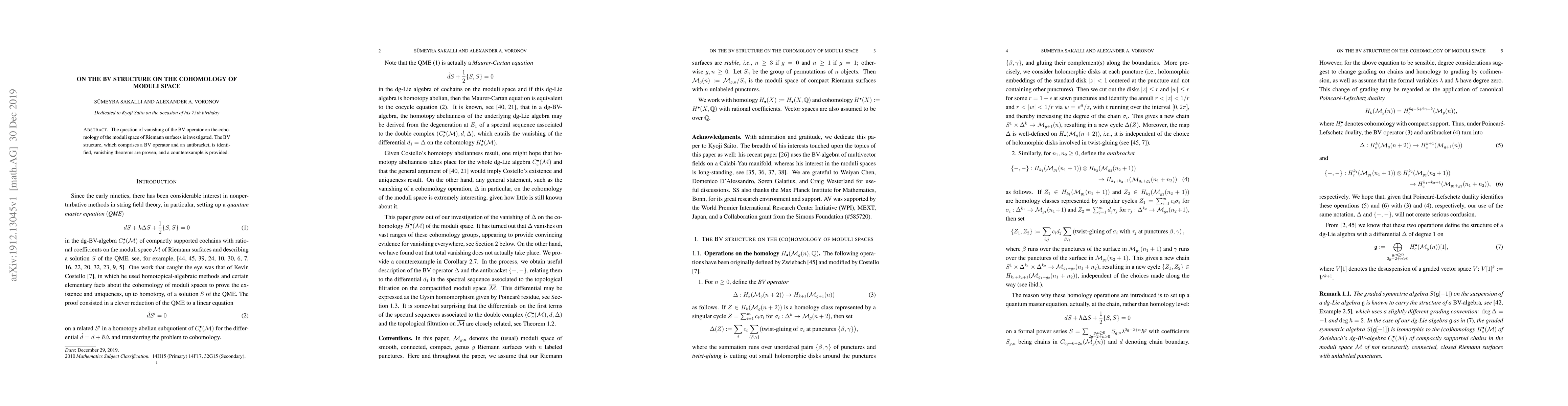 The paper investigates the BV structure on the cohomology of moduli space of Riemann surfaces, identifying the BV operator and antibracket, proving vanishing theorems, and presenting a counterexample to certain assumptions.