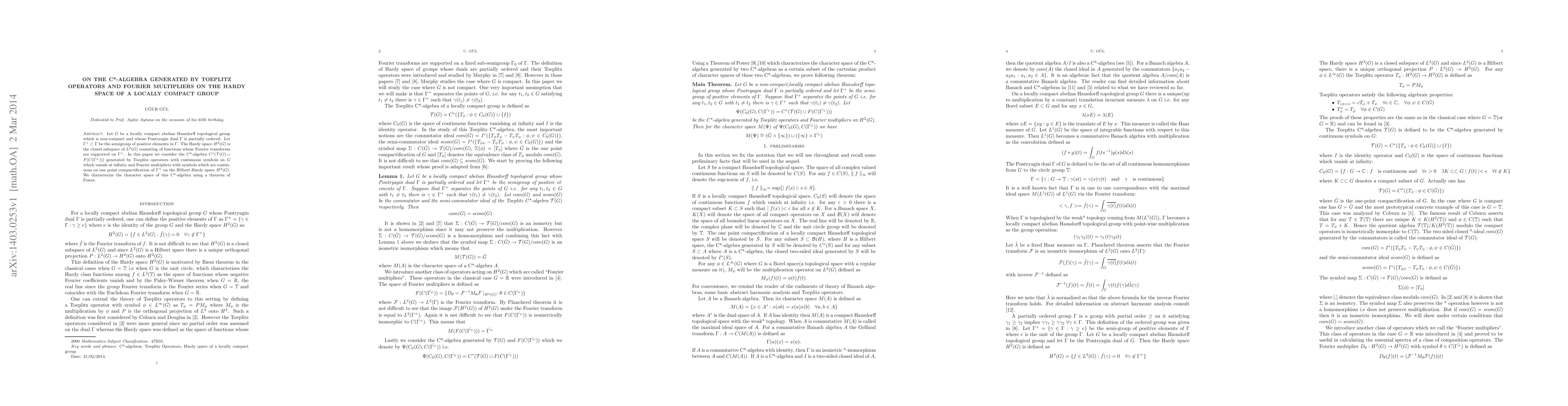 Let $G$ be a locally compact abelian Hausdorff topological group which is non-compact and whose Pontryagin dual $\Gamma$ is partially ordered. Let $\Gamma^{+}\subset\Gamma$ be the semigroup of positive elements in $\Gamma$. The Hardy space $H^{2}(G)$ is the closed subspace of $L^{2}(G)$ consisting of functions whose Fourier transforms are supported on $\Gamma^{+}$. In this paper we consider the C*-algebra $C^{*}(\mathcal{T}(G)\cup F(C(\dot{\Gamma^{+}})))$ generated by Toeplitz operators with continuous symbols on $G$ which vanish at infinity and Fourier multipliers with symbols which are continuous on one point compactification of $\Gamma^{+}$ on the Hilbert-Hardy space $H^{2}(G)$. We characterize the character space of this C*-algebra using a theorem of Power.