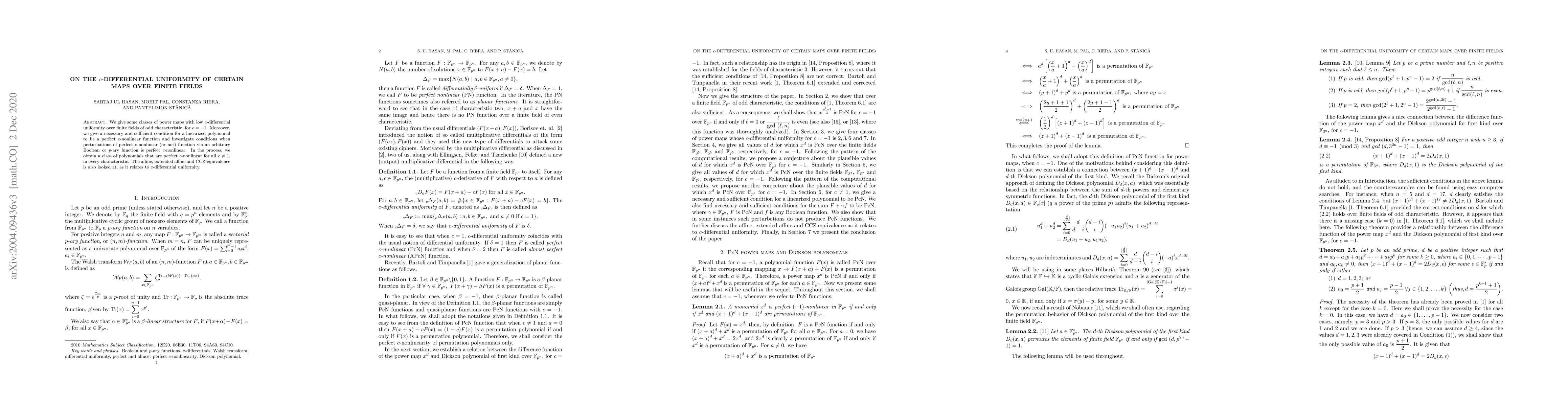 This paper investigates power maps over finite fields with odd characteristic that exhibit low $c$-differential uniformity for $c=-1$. It establishes conditions for linearized polynomials to be perfect $c$-nonlinear functions and explores how perturbations affect this property, concluding with a class of polynomials that remain perfect $c$-nonlinear for all $c\neq 1$ across any characteristic, while examining affine and extended affine equivalences.