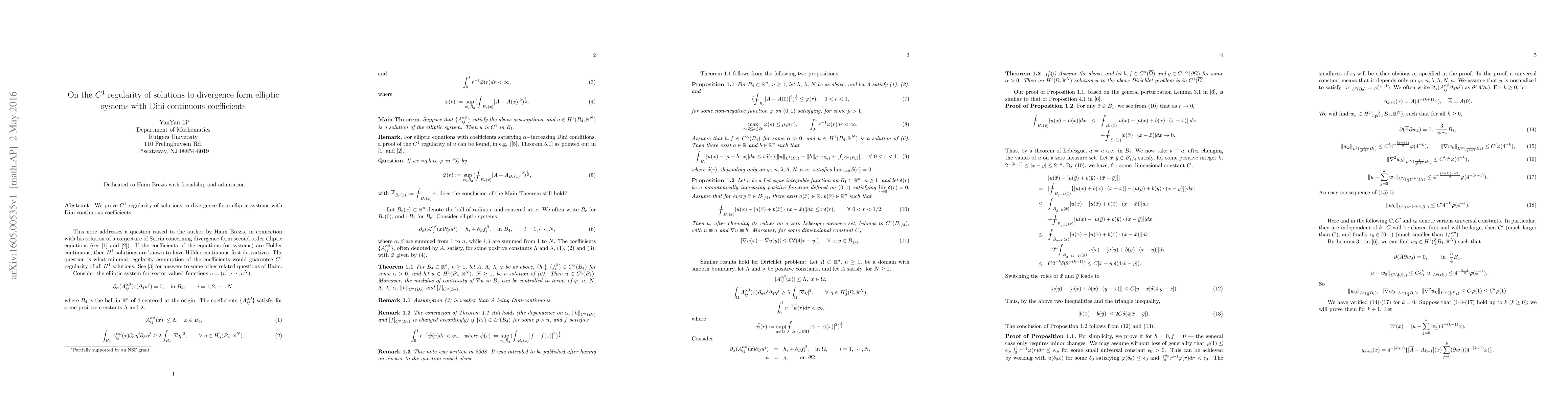Summary: This paper establishes $C^1$ regularity for solutions to divergence form elliptic systems where the coefficients are Dini-continuous, providing a significant improvement in understanding the smoothness properties of such solutions.