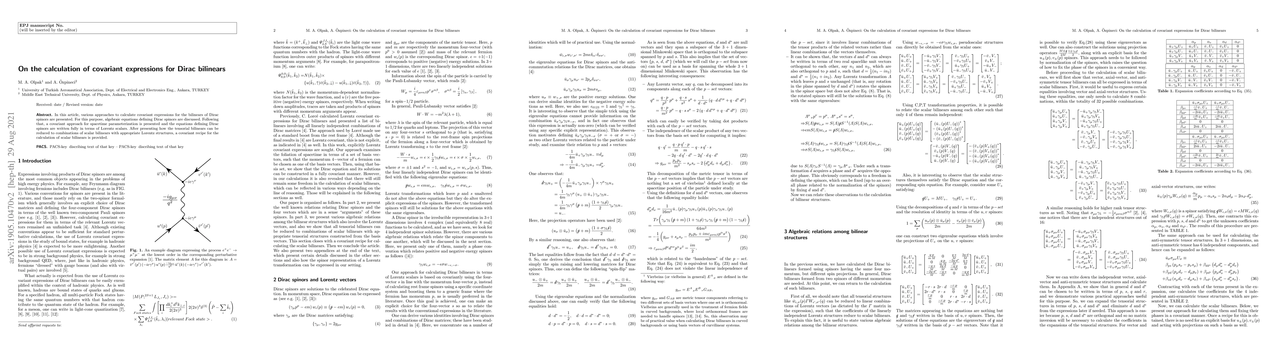 In this article, various approaches to calculate covariant expressions for the bilinears of Dirac spinors are presented. For this purpose, algebraic equations defining Dirac spinors are discussed. Following that, a covariant approach for spacetime parameterization is presented and the equations defining Dirac spinors are written fully in terms of Lorentz scalars. After presenting how the tensorial bilinears can be reduced to combinations of scalar bilinears with appropriate Lorentz structures, a covariant recipe for the calculation of scalar bilinears is provided.