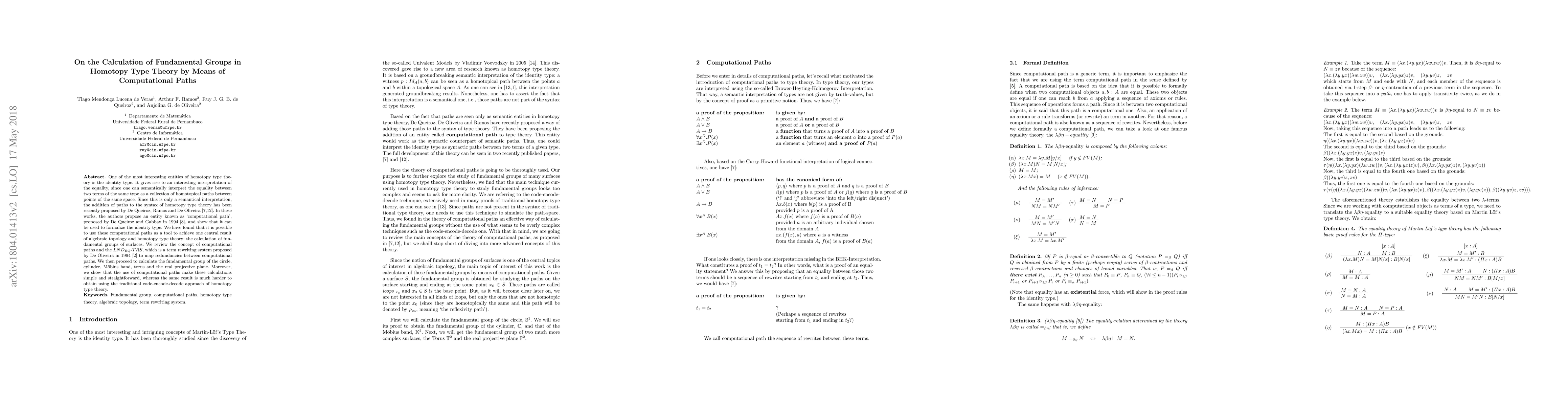 This paper explores the use of computational paths in homotopy type theory to calculate fundamental groups of various surfaces, demonstrating that this approach simplifies calculations compared to traditional methods. The authors review computational paths and the $LND_{EQ}-TRS$ term rewriting system, and apply these tools to compute the fundamental groups of the circle, cylinder, Möbius band, torus, and real projective plane.