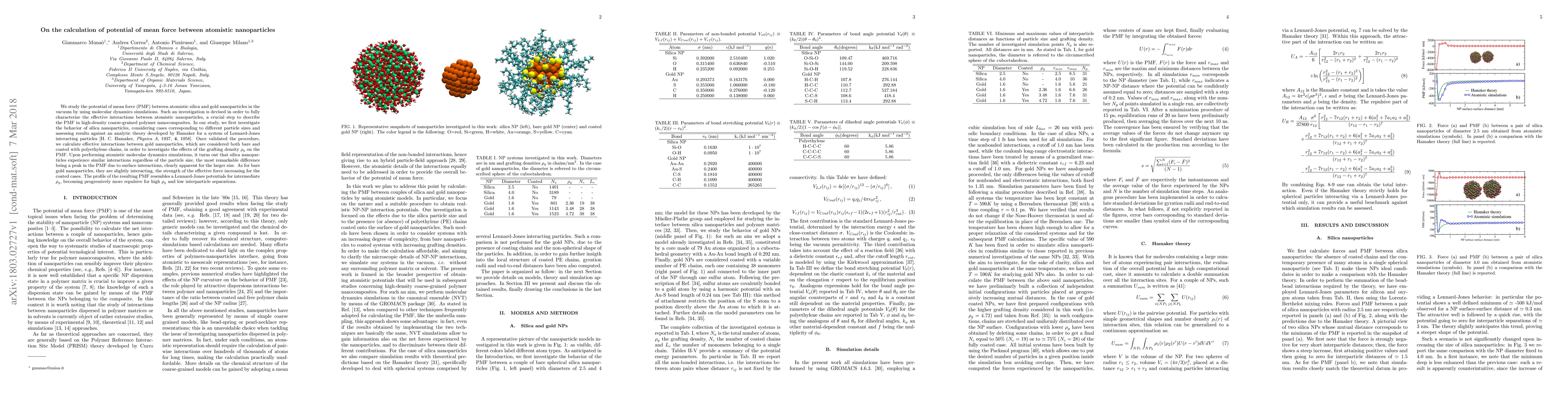 This paper investigates the potential of mean force (PMF) between atomistic silica and gold nanoparticles using molecular dynamics simulations. Silica nanoparticles show similar interactions regardless of size, with larger particles exhibiting a peak in PMF due to surface interactions. Gold nanoparticles, both bare and coated with polyethylene, show increasing effective force with higher grafting density, with PMF profiles resembling Lennard-Jones potentials at intermediate densities.