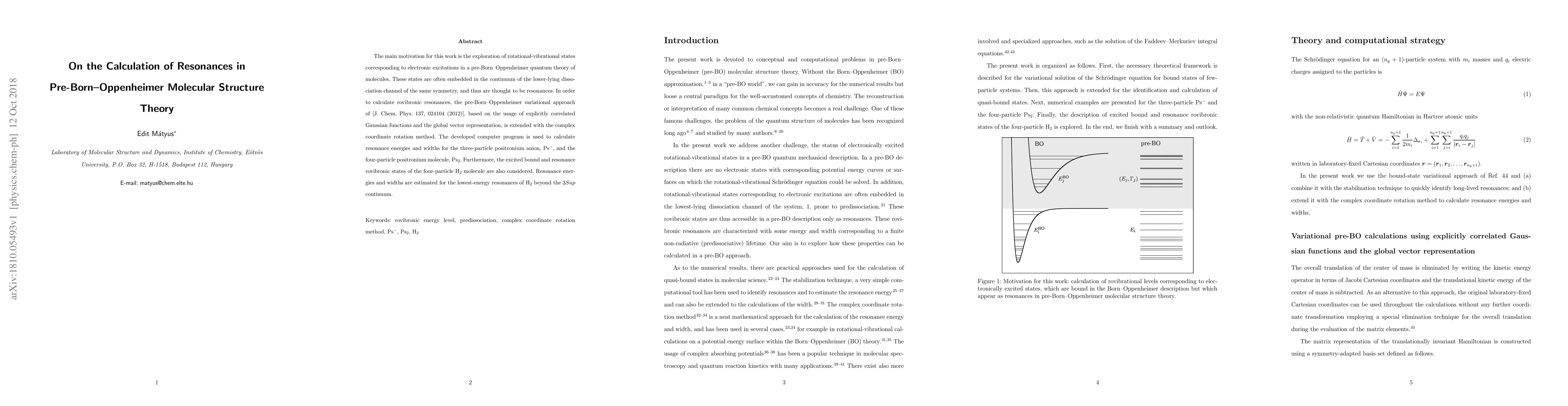 The main motivation for this work is the exploration of rotational-vibrational states corresponding to electronic excitations in a pre-Born-Oppenheimer quantum theory of molecules. These states are often embedded in the continuum of the lower-lying dissociation channel of the same symmetry, and thus are thought to be resonances. In order to calculate rovibronic resonances, the pre-Born-Oppenheimer variational approach of [J. Chem. Phys. 137, 024104 (2012)], based on the usage of explicitly correlated Gaussian functions and the global vector representation, is extended with the complex coordinate rotation method. The developed computer program is used to calculate resonance energies and widths for the three-particle positronium anion, Ps$^-$, and the four-particle positronium molecule, Ps$_2$. Furthermore, the excited bound and resonance rovibronic states of the four-particle H$_2$ molecule are also considered. Resonance energies and widths are estimated for the lowest-energy resonances of H$_2$ beyond the $b\ ^3\Sigma_\mathrm{u}^+$ continuum.