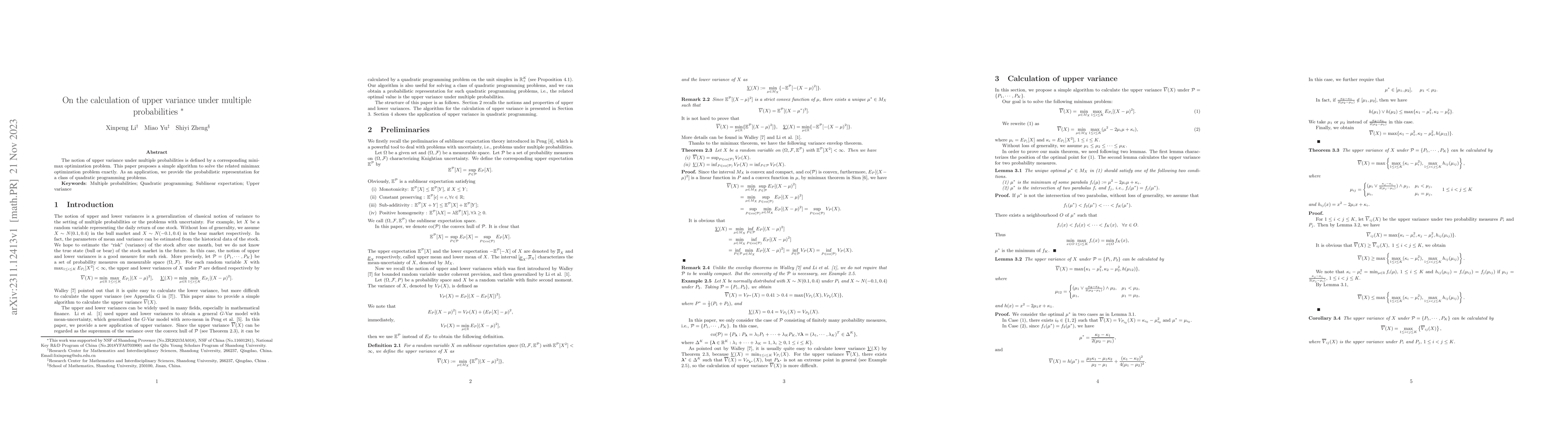 This paper introduces a new algorithm to solve the minimax optimization problem defining upper variance under multiple probabilities. It also applies this method to derive probabilistic representations for a class of quadratic programming problems.