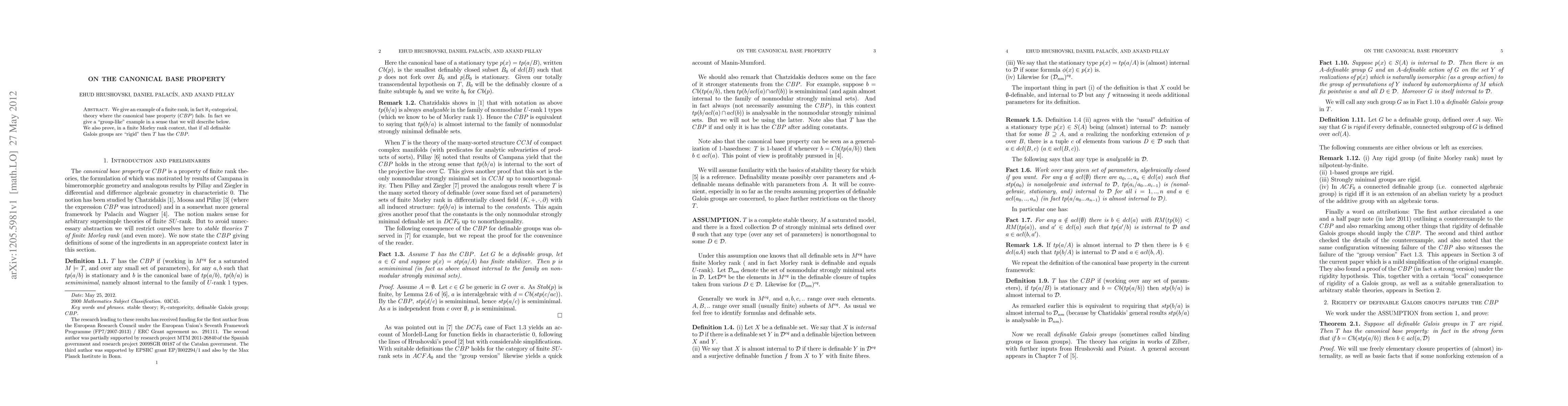 A finite theory with aleph-1 categorical properties has been found not to satisfy the canonical base property, while a rigid definable Galois group context guarantees it, offering insight into the relationships between these concepts.