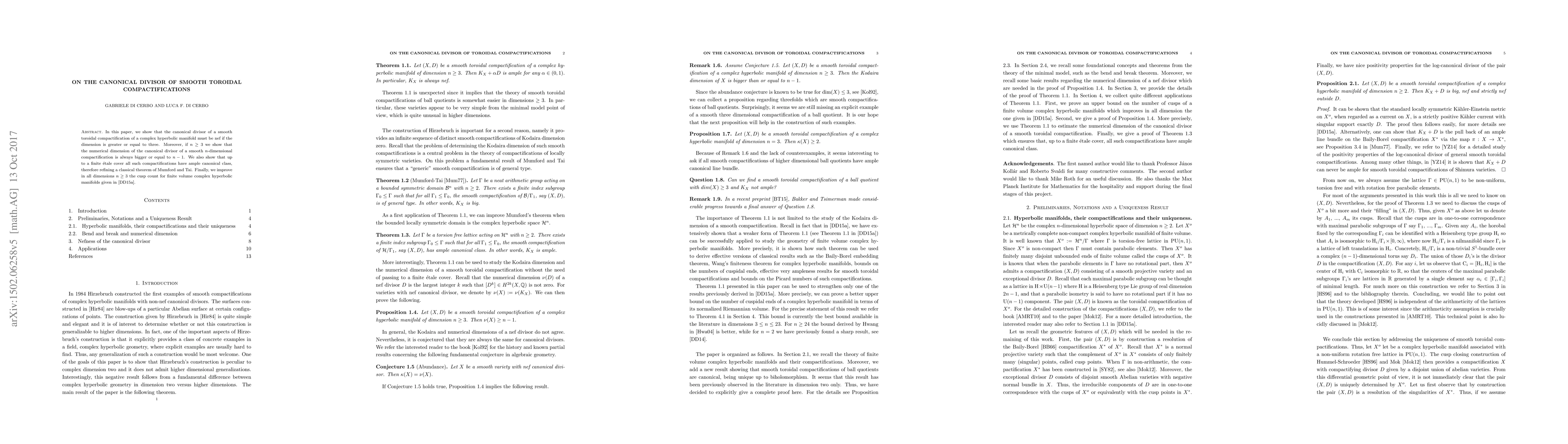 This paper proves that the canonical divisor of smooth toroidal compactifications of complex hyperbolic manifolds is nef for dimensions three or higher. It also establishes that the numerical dimension of the canonical divisor is at least $n-1$ for $n$-dimensional compactifications, and refines a classical theorem by showing all such compactifications have an ample canonical class up to a finite étale cover.