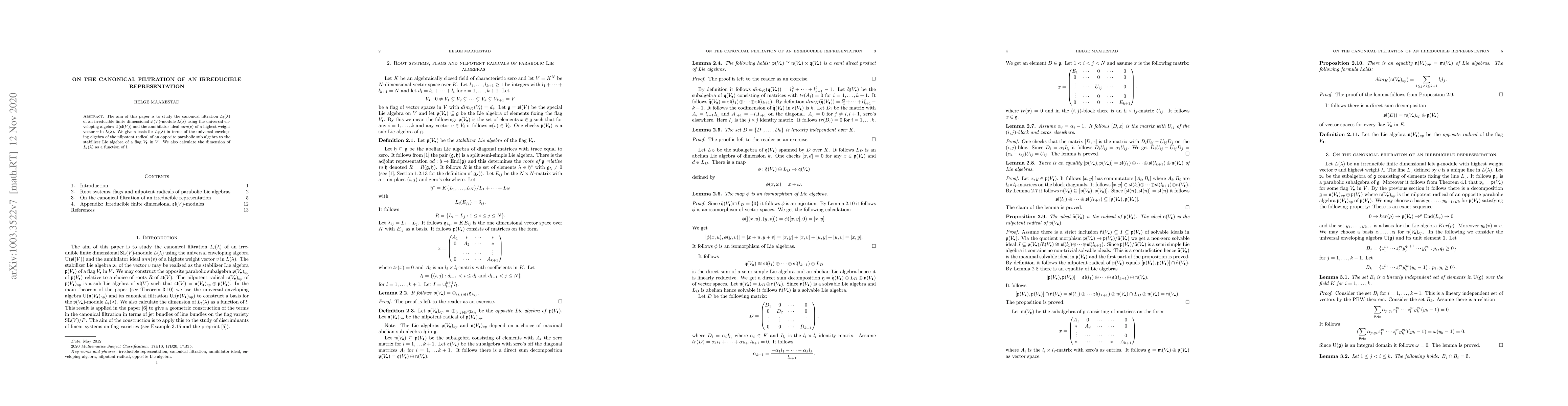 The aim of this paper is to study the canonical filtration $L(\lambda)_l$ of an irreducible finite dimensional $\operatorname{SL}(V)$-module $L(\lambda)$ using the universal enveloping algebra $U(\mathfrak{sl}(V))$ and the annihilator ideal $ann(v)$ of a highest weight vector $v$ in $L(\lambda)$. We give a basis for $L(\lambda)_l$ and calculate the dimension of $L(\lambda)_l$ as a function of $l$. This is done in terms of the universal enveloping algebra of the nilpotent radical of an opposite parabolic sub algebra of the stabilizer Lie algebra of a flag $V_*$ in $V$ with respect to a choice of roots for $\mathfrak{sl}(V)$.