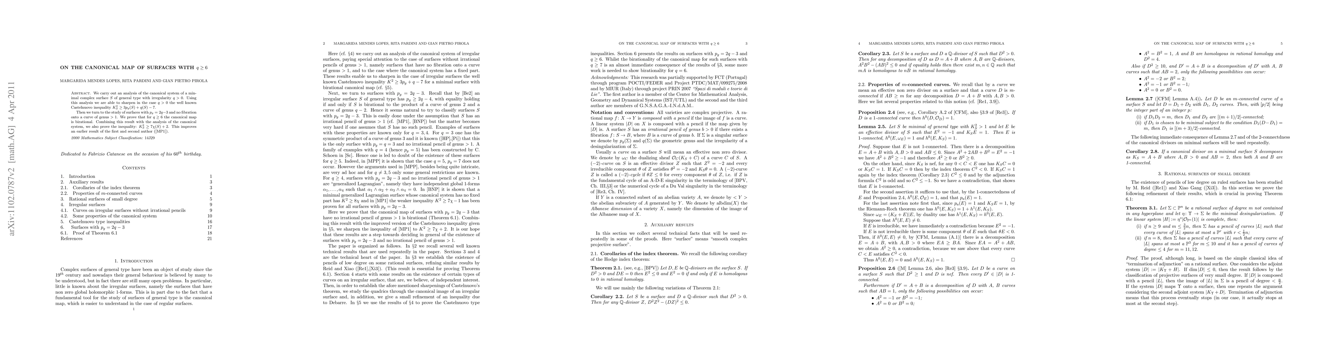 This paper analyzes the canonical system of minimal complex surfaces of general type with irregularity q>0, sharpening the Castelnuovo inequality for such surfaces. It proves that for q>=6, the canonical map is birational and establishes a new inequality K^2>=7χ+2, improving a previous result.