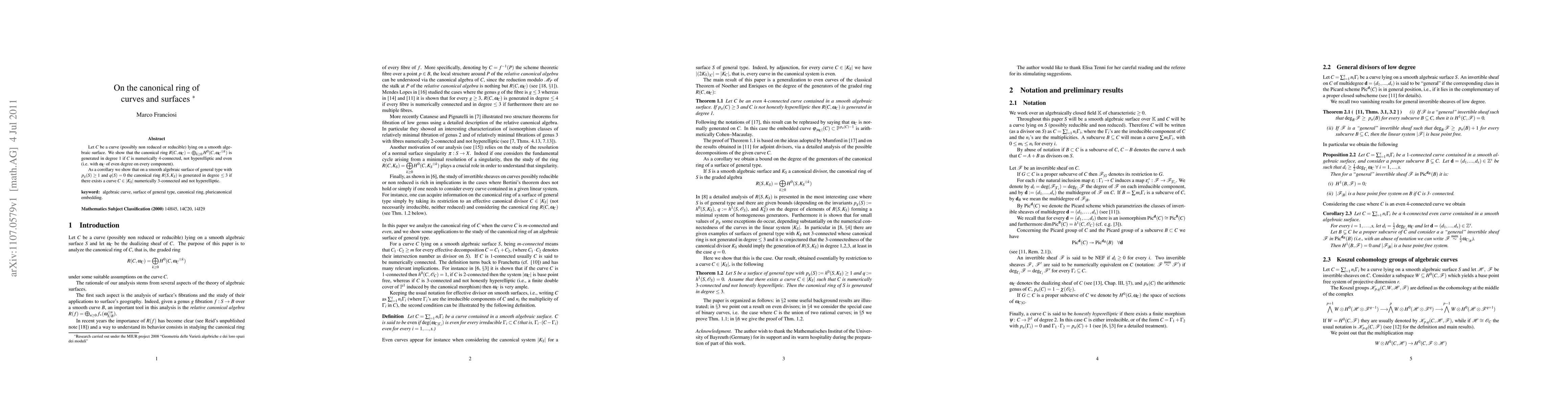 Let C be a curve (possibly non reduced or reducible) lying on a smooth algebraic surface. We show that the canonical ring R(C, \omega_C) is generated in degree 1 if C is numerically 4-connected, not hyperelliptic and even (i.e. with K_C of even degree on every component). As a corollary we show that on a smooth algebraic surface of general type with p_g(S)>0 and q(S)=0 the canonical ring R(S, K_S) is generated in degree \leq 3 if there exists a curve C in |K_S| numerically 3-connected and not hyperelliptic.