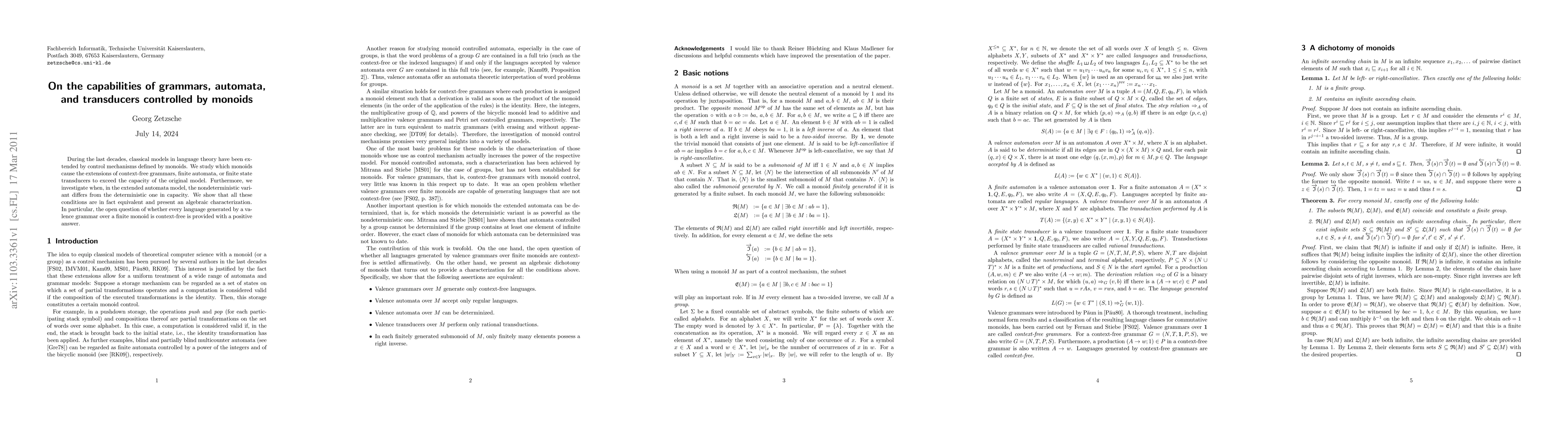 During the last decades, classical models in language theory have been extended by control mechanisms defined by monoids. We study which monoids cause the extensions of context-free grammars, finite automata, or finite state transducers to exceed the capacity of the original model. Furthermore, we investigate when, in the extended automata model, the nondeterministic variant differs from the deterministic one in capacity. We show that all these conditions are in fact equivalent and present an algebraic characterization. In particular, the open question of whether every language generated by a valence grammar over a finite monoid is context-free is provided with a positive answer.