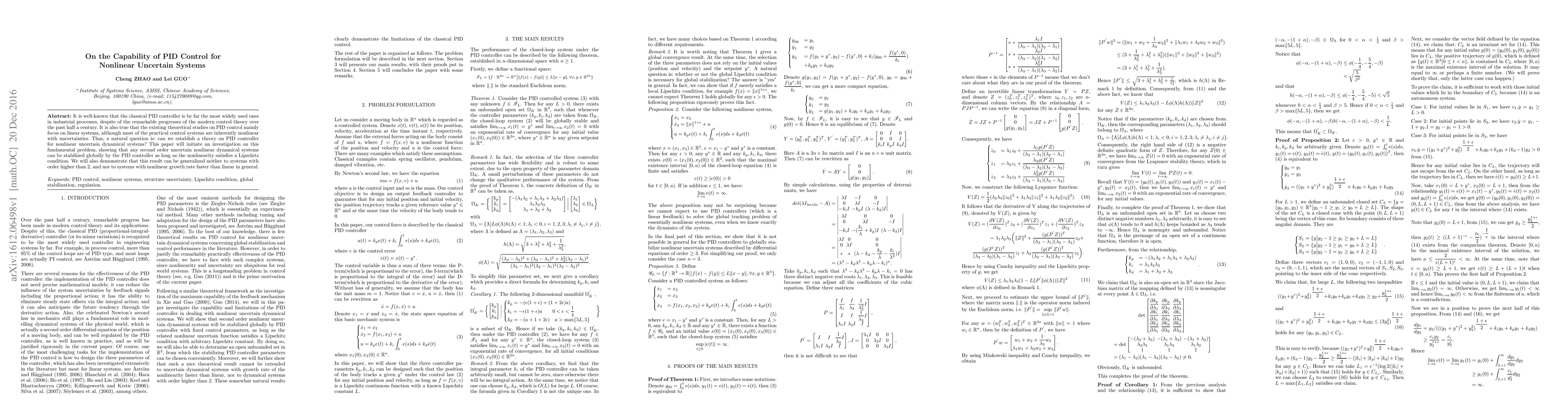 It is well-known that the classical PID controller is by far the most widely used ones in industrial processes, despite of the remarkable progresses of the modern control theory over the past half a century. It is also true that the existing theoretical studies on PID control mainly focus on linear systems, although most of the practical control systems are inherently nonlinear with uncertainties. Thus, a natural question is: can we establish a theory on PID controller for nonlinear uncertain dynamical systems? This paper will initiate an investigation on this fundamental problem, showing that any second order uncertain nonlinear dynamical systems can be stabilized globally by the PID controller as long as the nonlinearity satisfies a Lipschitz condition. We will also demonstrate that this result can be generalized neither to systems with order higher than 2, and nor to systems with nonlinear growth rate faster than linear in general.
