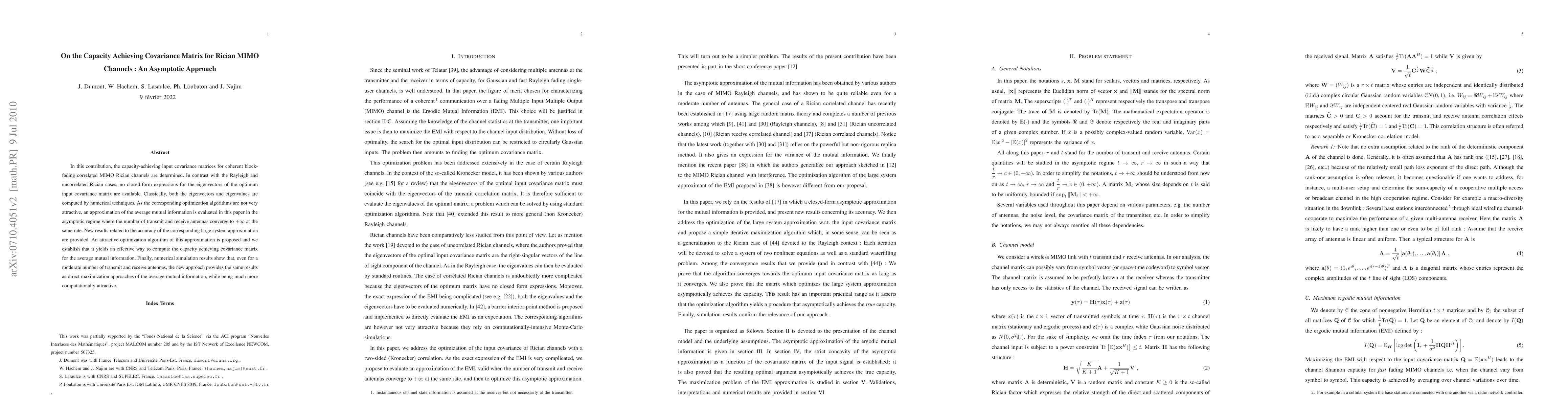 This paper determines the capacity-achieving covariance matrix for Rician MIMO channels in the asymptotic regime where the number of antennas is large. It proposes an optimization algorithm for an approximation of the average mutual information, demonstrating its computational efficiency and accuracy through numerical simulations.