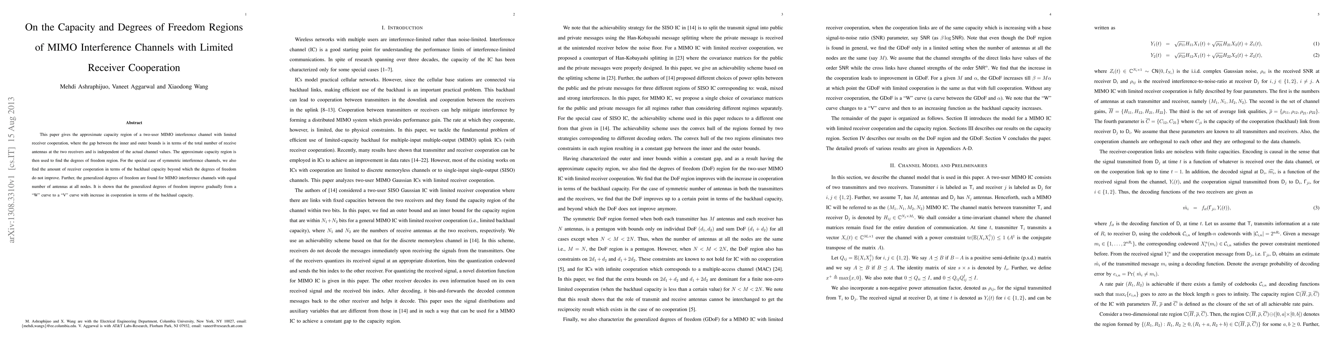 This paper determines the approximate capacity and degrees of freedom regions for a two-user MIMO interference channel with limited receiver cooperation, showing that the gap between bounds depends on the number of receive antennas rather than channel specifics. It also identifies the backhaul capacity threshold beyond which additional receiver cooperation does not enhance degrees of freedom.
