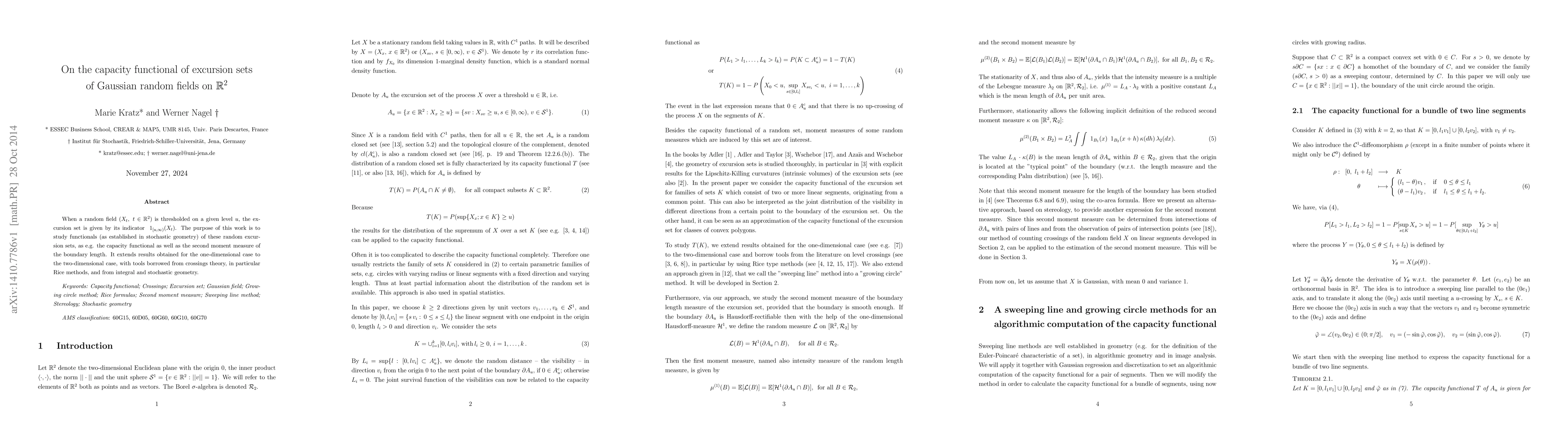 This research paper explores the capacity functional of excursion sets in 2D Gaussian random fields, extending one-dimensional results with tools from crossings theory and integral geometry.