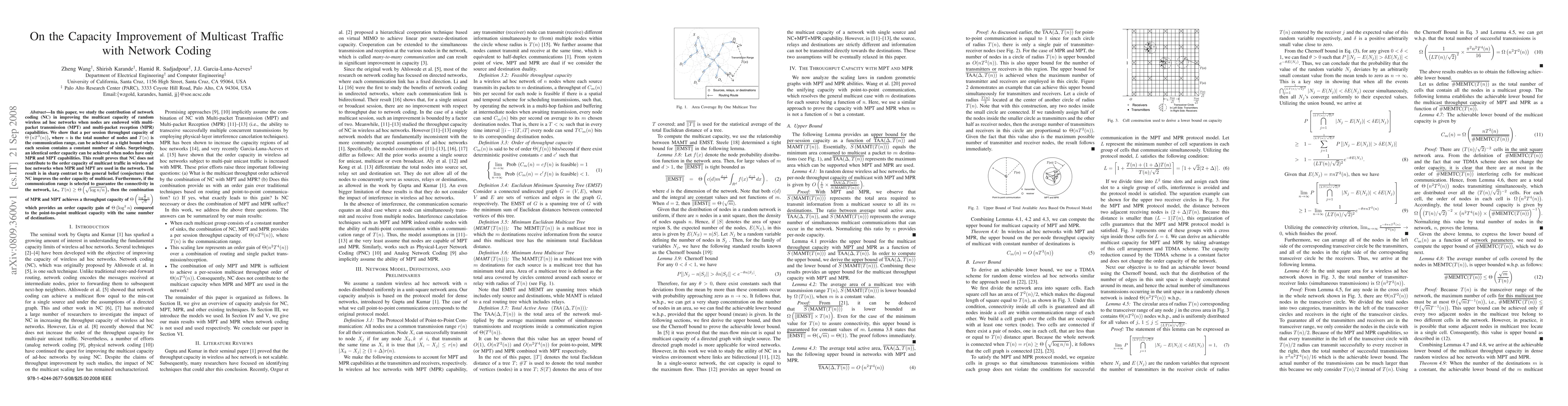 This paper demonstrates that network coding does not improve the order capacity of multicast traffic in random wireless ad hoc networks with multi-packet transmission and reception capabilities. It shows that a throughput capacity of $\Theta(nT^{3}(n))$ can be achieved, refuting the general belief that network coding enhances multicast capacity.