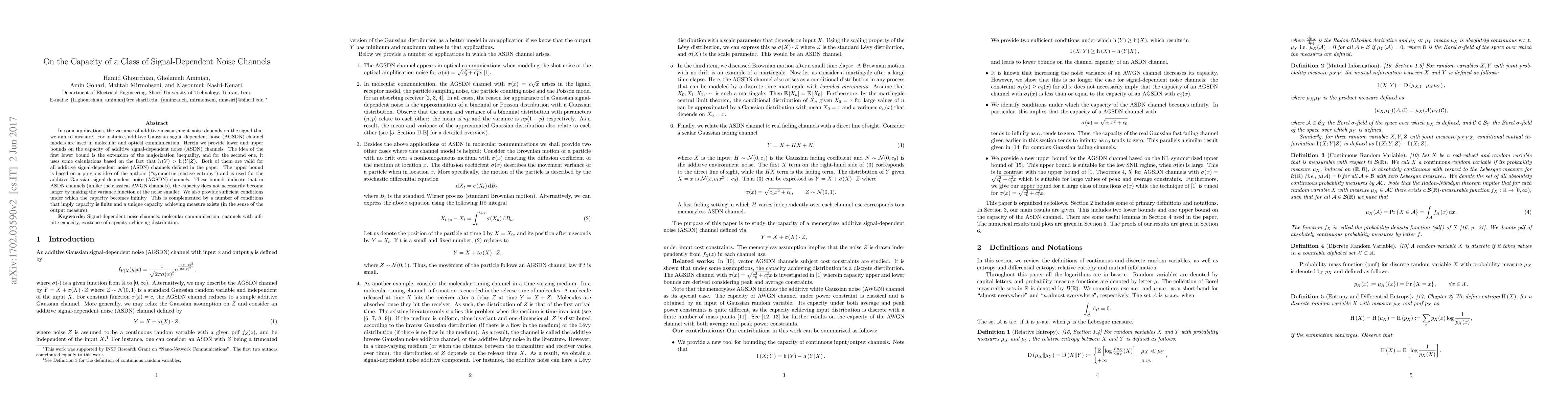 This paper establishes lower and upper bounds on the capacity of additive signal-dependent noise (ASDN) channels, showing that unlike classical AWGN channels, the capacity does not always increase with a smaller noise variance. It provides sufficient conditions for infinite capacity and conditions ensuring finite capacity with a unique achieving measure.