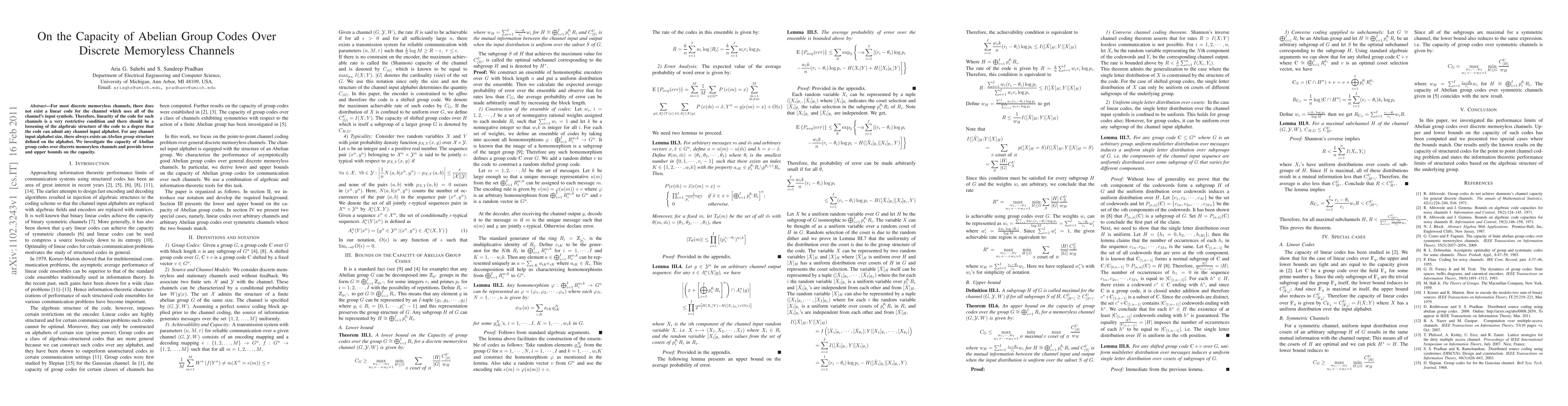 This paper explores the capacity of Abelian group codes over discrete memoryless channels, demonstrating that linearity is restrictive and proposing a more flexible algebraic structure. It provides bounds on the capacity for such codes, showing their potential to accommodate any channel input alphabet size.