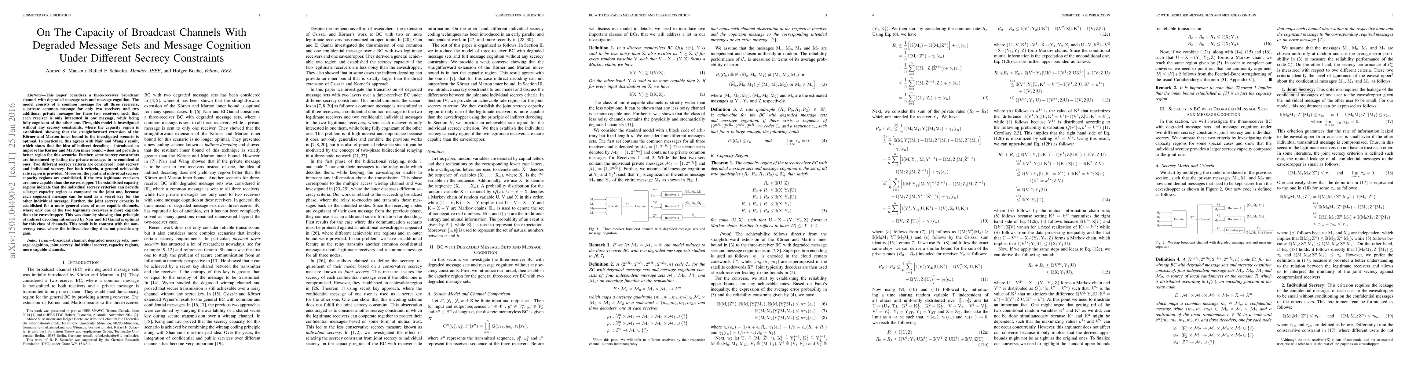 This paper considers a three-receiver broadcast channel with degraded message sets and message cognition. The model consists of a common message for all three receivers, a private common message for only two receivers and two additional private messages for these two receivers, such that each receiver is only interested in one message, while being fully cognizant of the other one. First, this model is investigated without any secrecy constraints, where the capacity region is established, showing that the straightforward extension of the K\"orner and Marton inner bound to the investigated scenario is optimal. In particular, this agrees with Nair and Wang's result, which states that the idea of indirect decoding - introduced to improve the K\"orner and Marton inner bound - does not provide a better region for this scenario. Further, some secrecy constraints are introduced by letting the private messages to be confidential ones. Two different secrecy criteria are considered: joint secrecy and individual secrecy. For both criteria, a general achievable rate region is provided. Moreover, the joint and individual secrecy capacity regions are established, if the two legitimate receivers are more capable than the eavesdropper. The established capacity regions indicate that the individual secrecy criterion can provide a larger capacity region as compared to the joint one, because each cognizant message can be used as a secret key for the other individual message. Further, the joint secrecy capacity is established for a more general class of more capable channels, where only one of the two legitimate receivers is more capable than the eavesdropper. This was done by showing that principle of indirect decoding introduced by Nair and El Gamal is optimal for this class of channels. This result is in contrast with the nonsecrecy case, where the indirect decoding does not provide any gain.