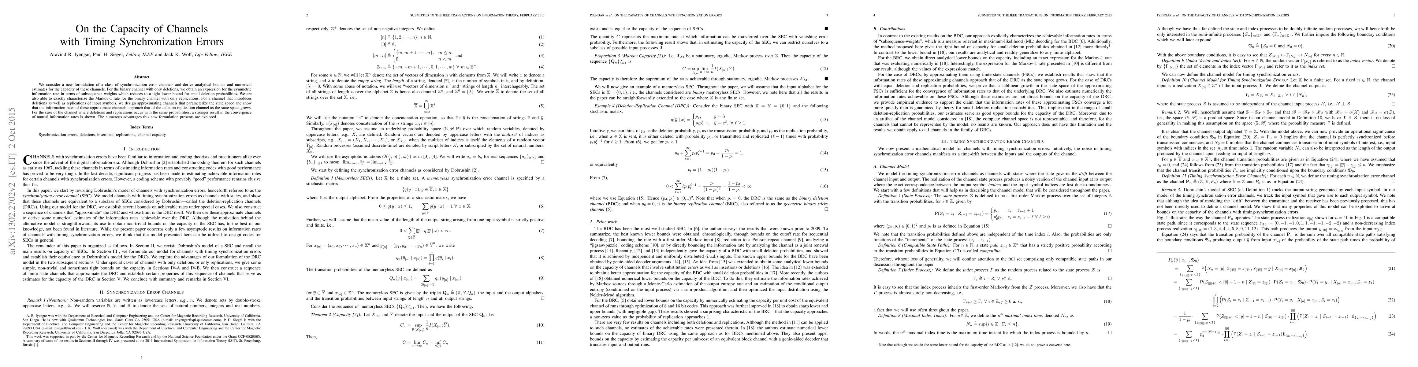 This paper formulates synchronization error channels and derives analytical bounds for their capacities. It provides exact characterizations and approximations for channels with deletions, replications, and both, showing convergence of mutual information rates under certain conditions.