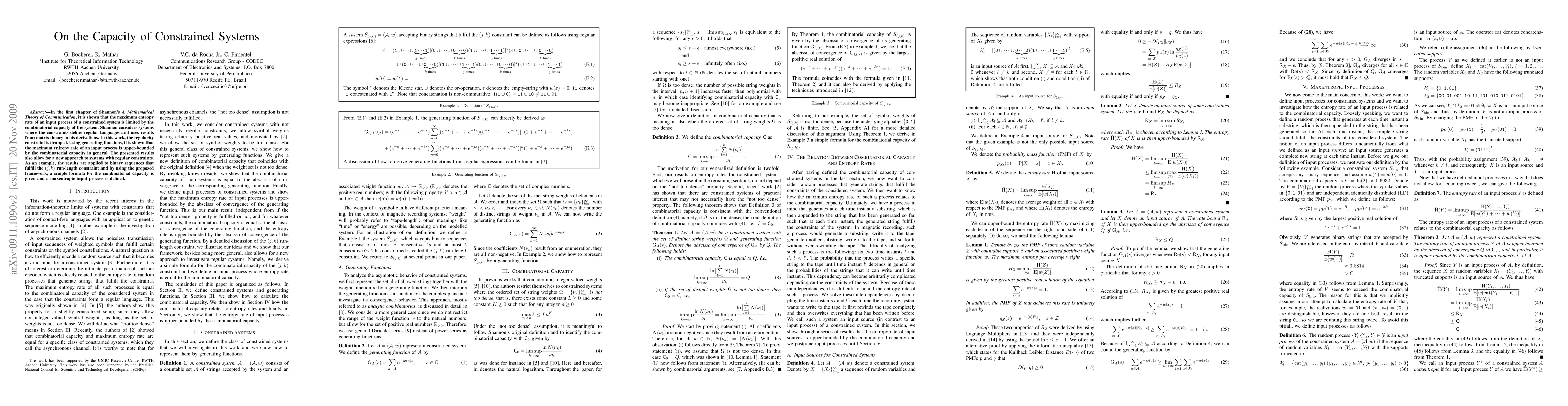 In the first chapter of Shannon's "A Mathematical Theory of Communication," it is shown that the maximum entropy rate of an input process of a constrained system is limited by the combinatorial capacity of the system. Shannon considers systems where the constraints define regular languages and uses results from matrix theory in his derivations. In this work, the regularity constraint is dropped. Using generating functions, it is shown that the maximum entropy rate of an input process is upper-bounded by the combinatorial capacity in general. The presented results also allow for a new approach to systems with regular constraints. As an example, the results are applied to binary sequences that fulfill the (j,k) run-length constraint and by using the proposed framework, a simple formula for the combinatorial capacity is given and a maxentropic input process is defined.