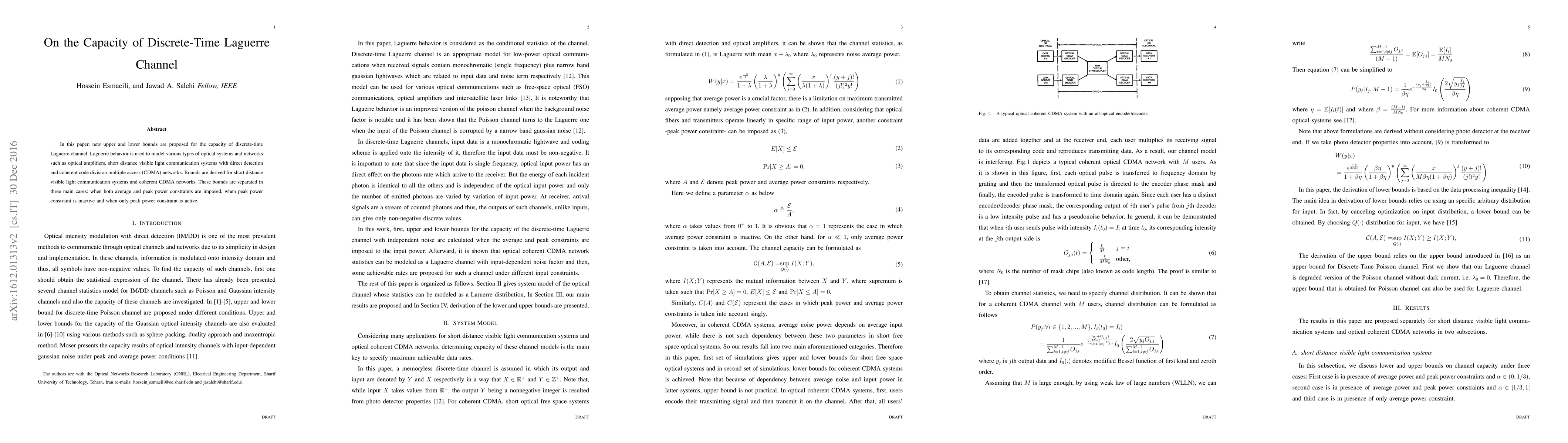 In this paper, new upper and lower bounds are proposed for the capacity of discrete-time Laguerre channel. Laguerre behavior is used to model various types of optical systems and networks such as optical amplifiers, short distance visible light communication systems with direct detection and coherent code division multiple access (CDMA) networks. Bounds are derived for short distance visible light communication systems and coherent CDMA networks. These bounds are separated in three main cases: when both average and peak power constraints are imposed, when peak power constraint is inactive and when only peak power constraint is active.