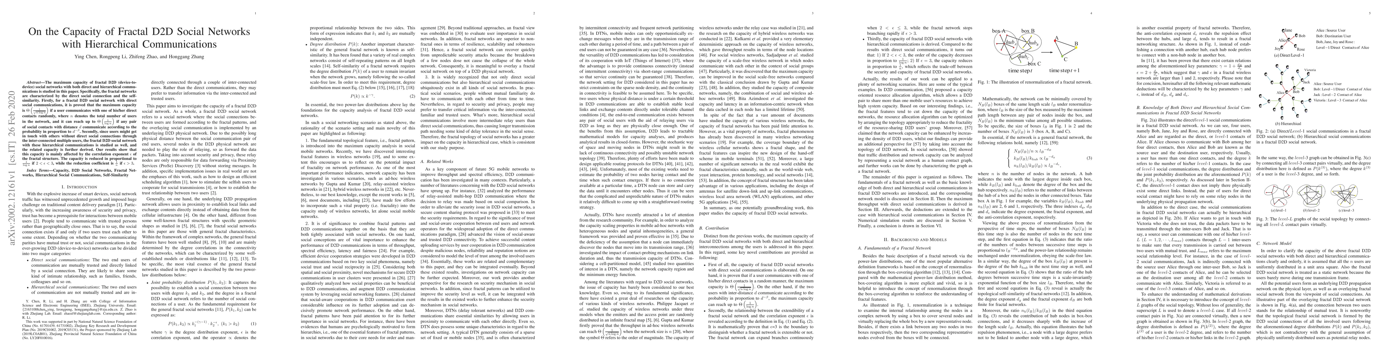 The maximum capacity of fractal D2D (device-to-device) social networks with both direct and hierarchical communications is studied in this paper. Specifically, the fractal networks are characterized by the direct social connection and the self-similarity. Firstly, for a fractal D2D social network with direct social communications, it is proved that the maximum capacity is $ \Theta\left(\frac{1}{\sqrt{n\log n}}\right) $ if a user communicates with one of his/her direct contacts randomly, where $ n $ denotes the total number of users in the network, and it can reach up to $ \Theta\left(\frac{1}{\log n}\right) $ if any pair of social contacts with distance $ d $ communicate according to the probability in proportion to $ d^{-\beta} $. Secondly, since users might get in touch with others without direct social connections through the inter-connected multiple users, the fractal D2D social network with these hierarchical communications is studied as well, and the related capacity is further derived. Our results show that this capacity is mainly affected by the correlation exponent $\epsilon$ of the fractal structure. The capacity is reduced in proportional to $ \frac{1}{{\log n}} $ if $ 2<\epsilon<3 $, while the reduction coefficient is $ \frac{1}{n} $ if $ \epsilon>3 $.