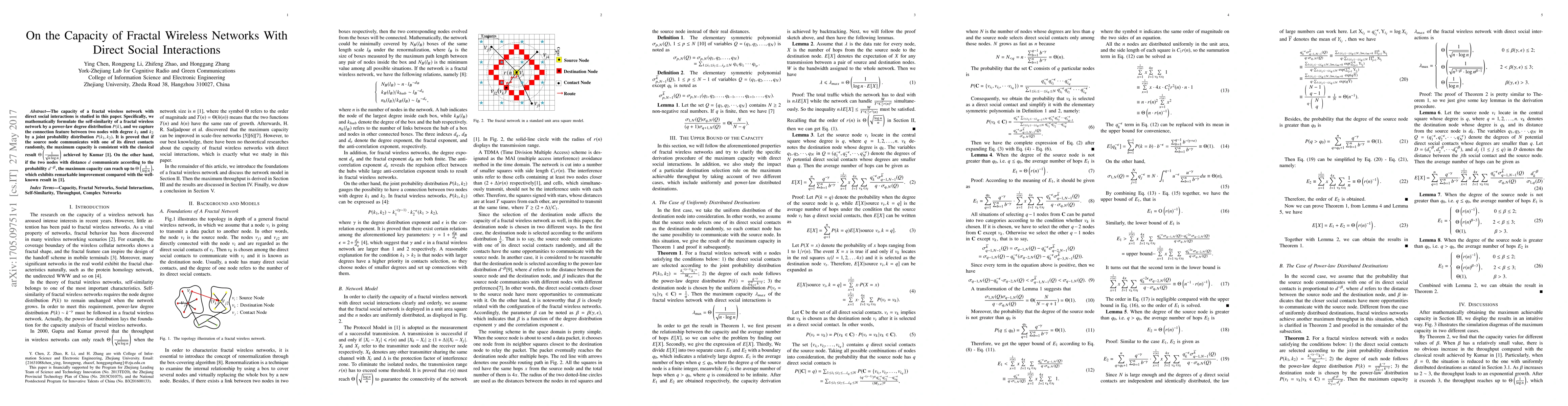 The capacity of a fractal wireless network with direct social interactions is studied in this paper. Specifically, we mathematically formulate the self-similarity of a fractal wireless network by a power-law degree distribution $ P(k) $, and we capture the connection feature between two nodes with degree $ k_{1} $ and $ k_{2} $ by a joint probability distribution $ P(k_{1},k_{2}) $. It is proved that if the source node communicates with one of its direct contacts randomly, the maximum capacity is consistent with the classical result $ \Theta\left(\frac{1}{\sqrt{n\log n}}\right) $ achieved by Kumar \cite{Gupta2000The}. On the other hand, if the two nodes with distance $ d $ communicate according to the probability $ d^{-\beta} $, the maximum capacity can reach up to $ \Theta\left(\frac{1}{\log n}\right) $, which exhibits remarkable improvement compared with the well-known result in \cite{Gupta2000The}.