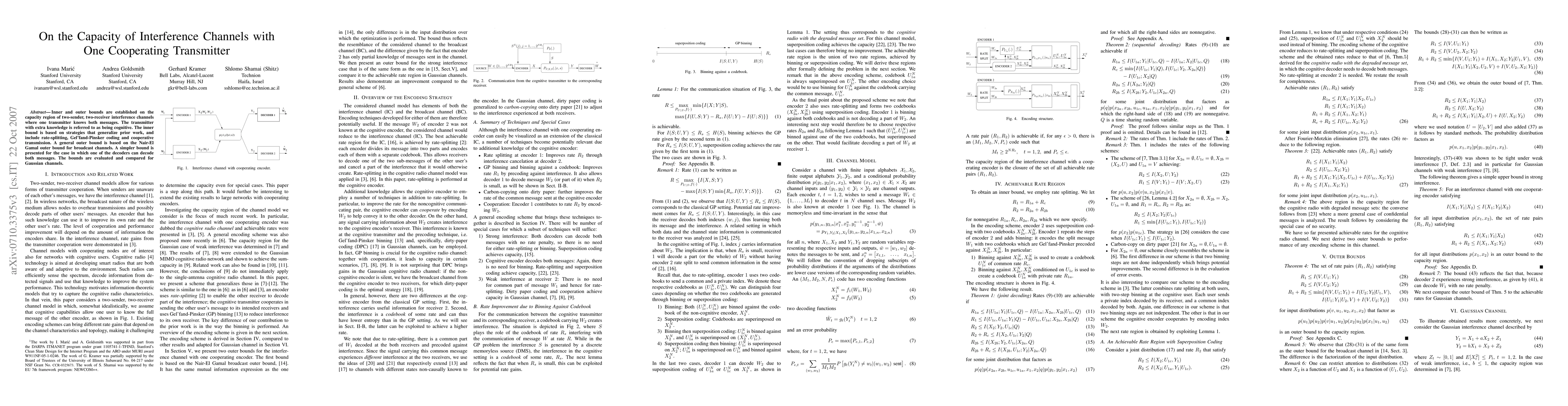 This paper establishes inner and outer bounds on the capacity region of two-sender, two-receiver interference channels with one cognitive transmitter. The inner bound leverages strategies like rate-splitting and cooperative transmission, while the outer bound uses the Nair-El Gamal method for broadcast channels.