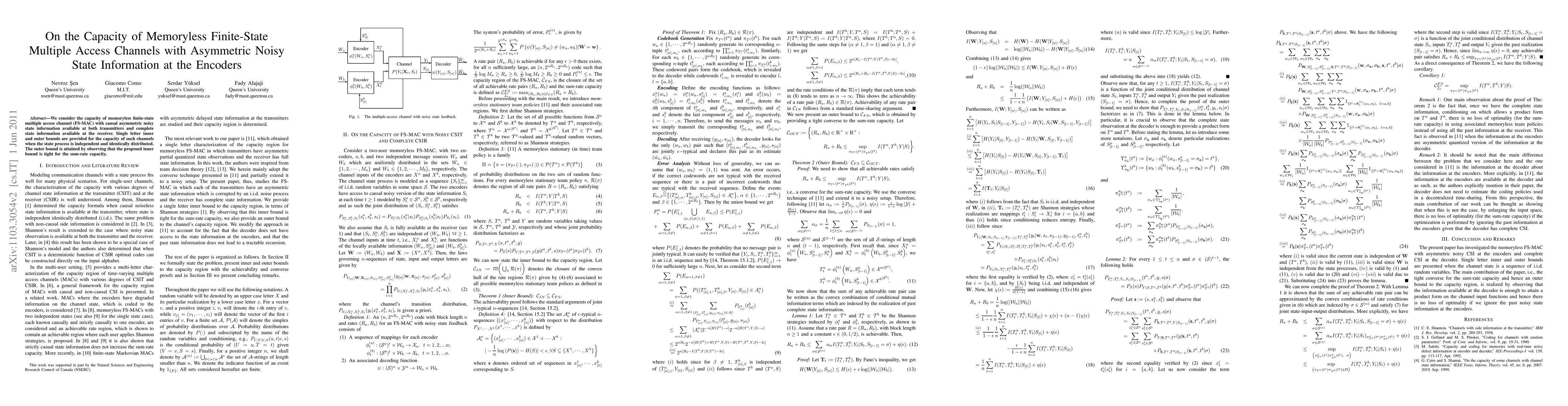 Summary: This paper investigates the capacity of memoryless finite-state multiple access channels with asymmetric noisy state information at the encoders, providing single-letter inner and outer bounds for the sum-rate capacity when the state process is independent and identically distributed. The outer bound is shown to be tight.