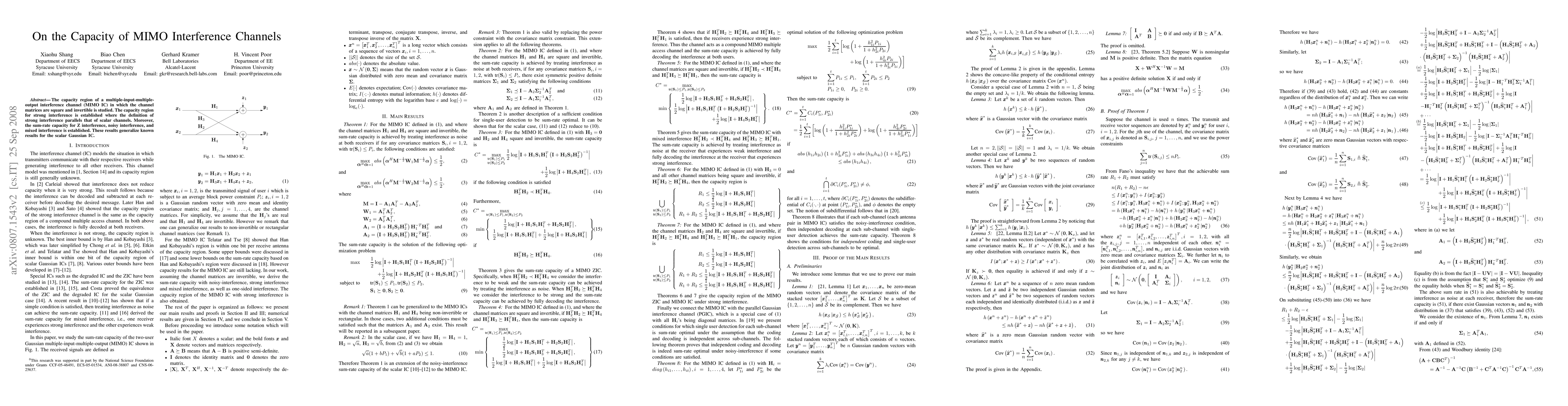 The capacity region of a multiple-input-multiple-output interference channel (MIMO IC) where the channel matrices are square and invertible is studied. The capacity region for strong interference is established where the definition of strong interference parallels that of scalar channels. Moreover, the sum-rate capacity for Z interference, noisy interference, and mixed interference is established. These results generalize known results for the scalar Gaussian IC.