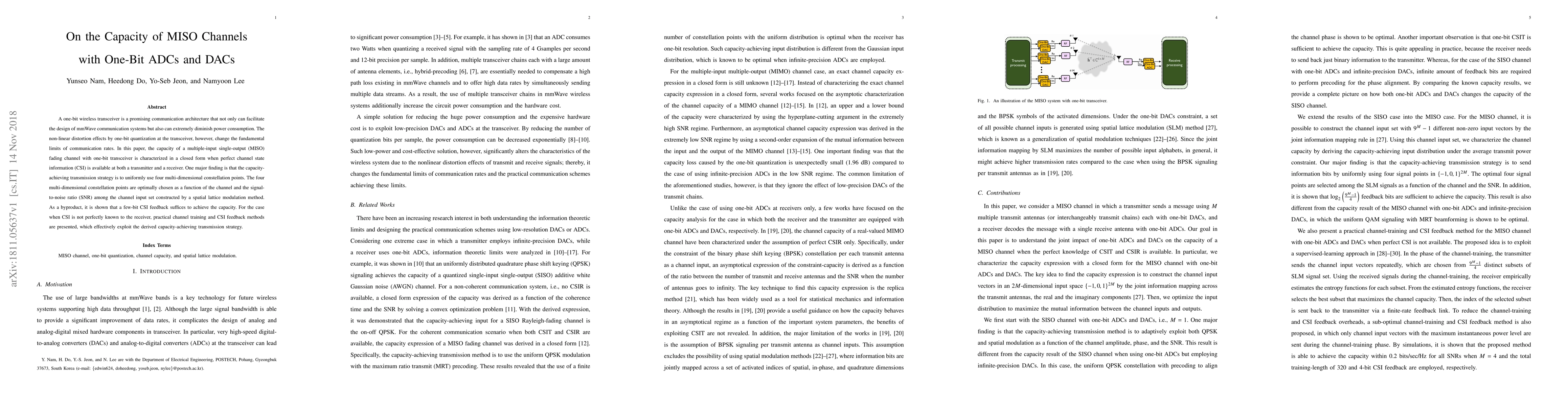 Researchers found that a one-bit transceiver can achieve capacity in an MISO channel with four optimally chosen constellation points, requiring only a few-bit CSI feedback. This approach enables efficient power consumption and communication rates.