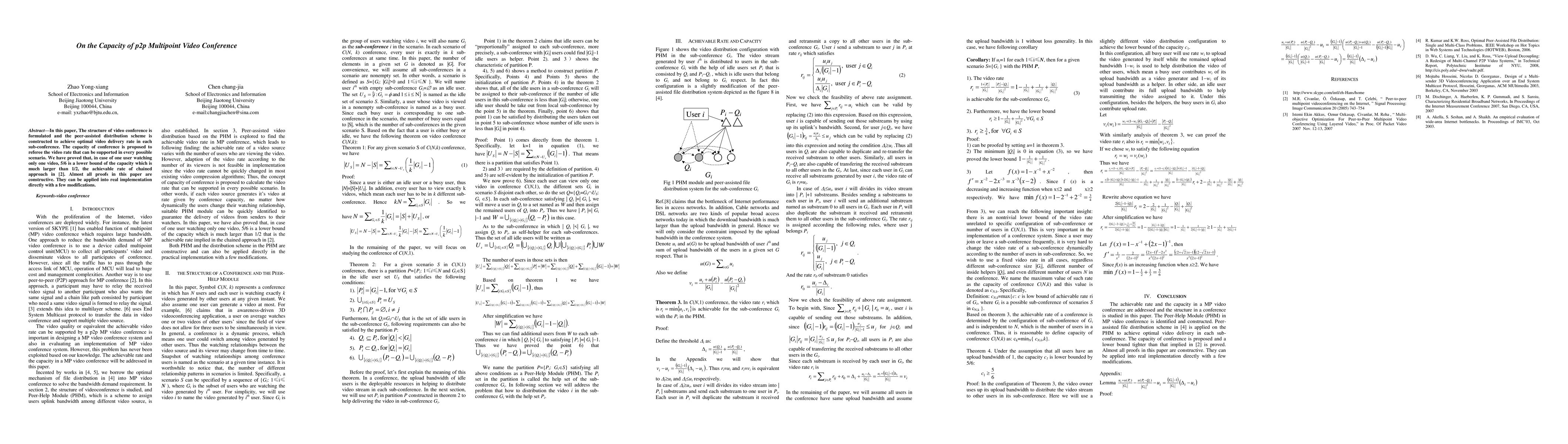 This paper formulates the structure of a peer-to-peer multipoint video conference and constructs a peer-assisted distribution scheme to optimize video delivery rates. It proposes a capacity metric to evaluate the maximum video rate supported in various scenarios, proving that 5/6 is a lower bound for the capacity, significantly surpassing the 1/2 rate achievable by a chained approach.