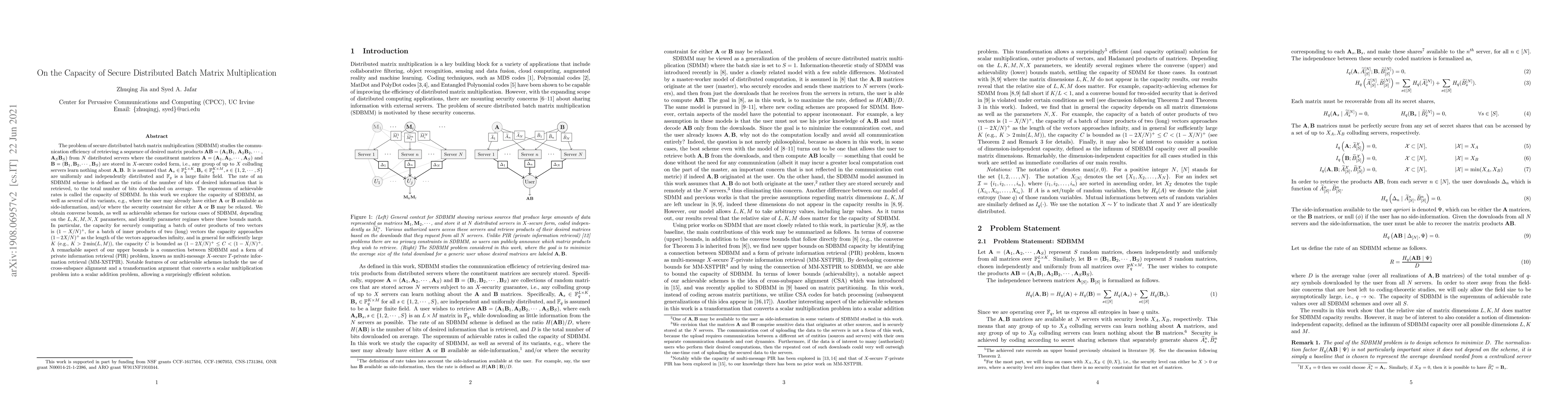 This paper investigates the capacity of secure distributed batch matrix multiplication (SDBMM) under $X$-secure coding, exploring achievable rates and converse bounds for various scenarios. It establishes connections between SDBMM and a multi-message $X$-secure $T$-private information retrieval (MM-XSTPIR) problem, and proposes efficient schemes using cross-subspace alignment and transformation arguments.