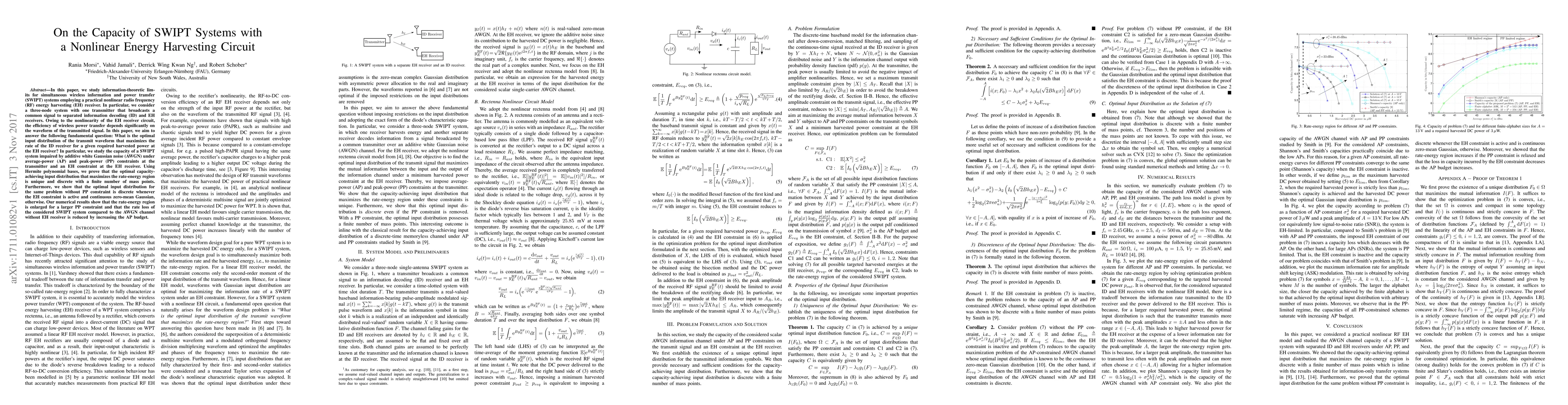In this paper, we study information-theoretic limits for simultaneous wireless information and power transfer (SWIPT) systems employing a practical nonlinear radio frequency (RF) energy harvesting (EH) receiver. In particular, we consider a three-node system with one transmitter that broadcasts a common signal to separated information decoding (ID) and EH receivers. Owing to the nonlinearity of the EH receiver circuit, the efficiency of wireless power transfer depends significantly on the waveform of the transmitted signal. In this paper, we aim to answer the following fundamental question: What is the optimal input distribution of the transmit waveform that maximizes the rate of the ID receiver for a given required harvested power at the EH receiver? In particular, we study the capacity of a SWIPT system impaired by additive white Gaussian noise (AWGN) under average-power (AP) and peak-power (PP) constraints at the transmitter and an EH constraint at the EH receiver. Using Hermite polynomial bases, we prove that the optimal capacity-achieving input distribution that maximizes the rate-energy region is unique and discrete with a finite number of mass points. Furthermore, we show that the optimal input distribution for the same problem without PP constraint is discrete whenever the EH constraint is active and continuous zero-mean Gaussian, otherwise. Our numerical results show that the rate-energy region is enlarged for a larger PP constraint and that the rate loss of the considered SWIPT system compared to the AWGN channel without EH receiver is reduced by increasing the AP budget.