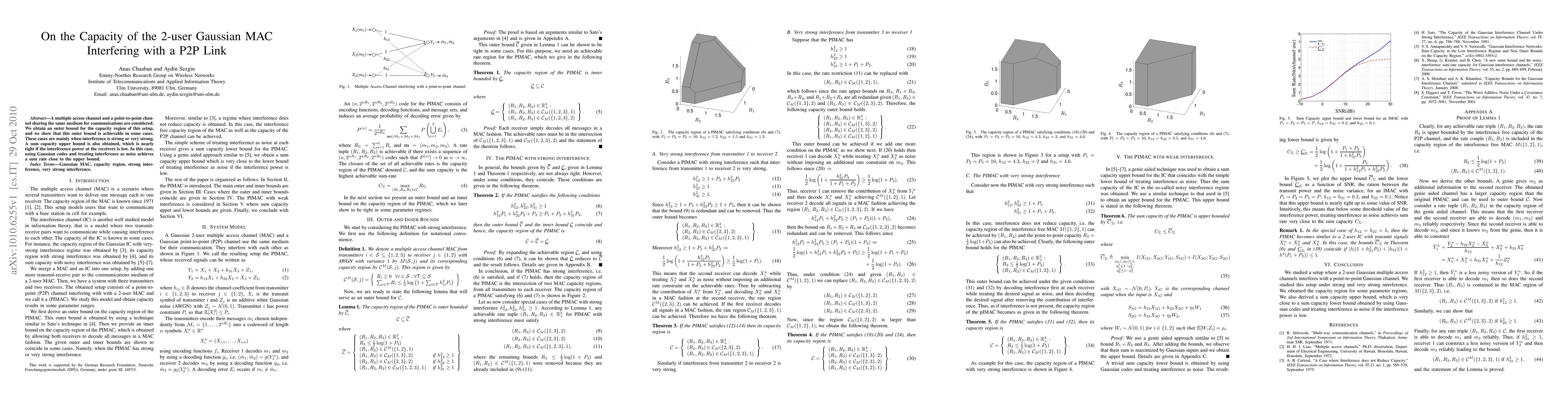 This paper investigates the capacity of a 2-user Gaussian multiple access channel (MAC) interfering with a point-to-point (P2P) link. It provides an outer bound for the capacity region and demonstrates its achievability under strong interference conditions, while also deriving a nearly tight sum capacity upper bound for low interference power scenarios.