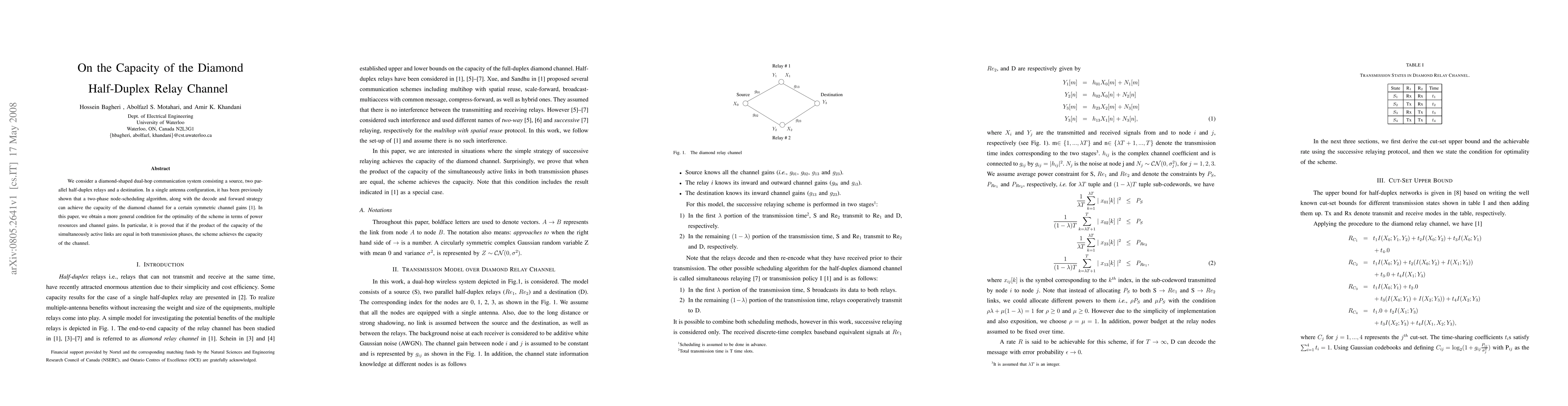 We consider a diamond-shaped dual-hop communication system consisting a source, two parallel half-duplex relays and a destination. In a single antenna configuration, it has been previously shown that a two-phase node-scheduling algorithm, along with the decode and forward strategy can achieve the capacity of the diamond channel for a certain symmetric channel gains [1]. In this paper, we obtain a more general condition for the optimality of the scheme in terms of power resources and channel gains. In particular, it is proved that if the product of the capacity of the simultaneously active links are equal in both transmission phases, the scheme achieves the capacity of the channel.