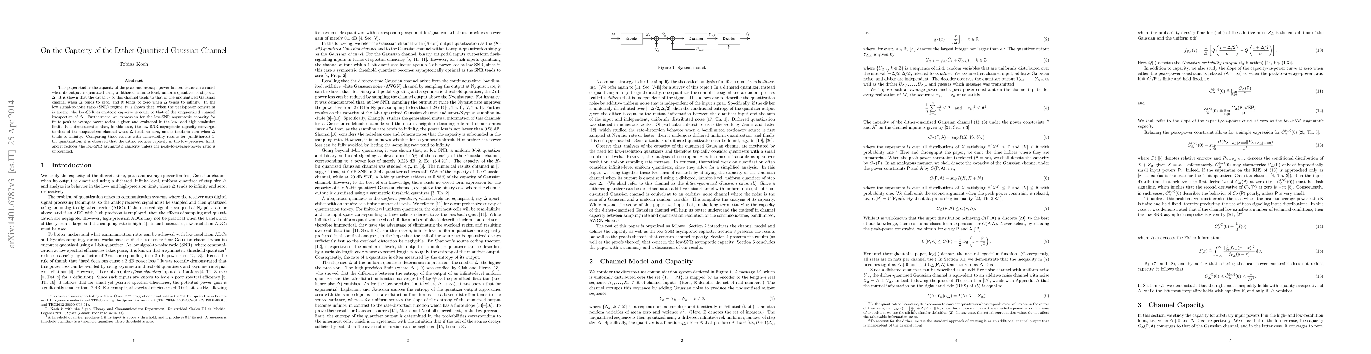 This paper investigates the capacity of a peak-and-average-power-limited Gaussian channel with dither-quantized output, showing that capacity approaches that of the unquantized channel as the quantization step size $\Delta$ approaches zero, and diminishes to zero as $\Delta$ increases. In low SNR conditions, it finds that capacity equals that of the unquantized channel when peak-power constraints are absent.