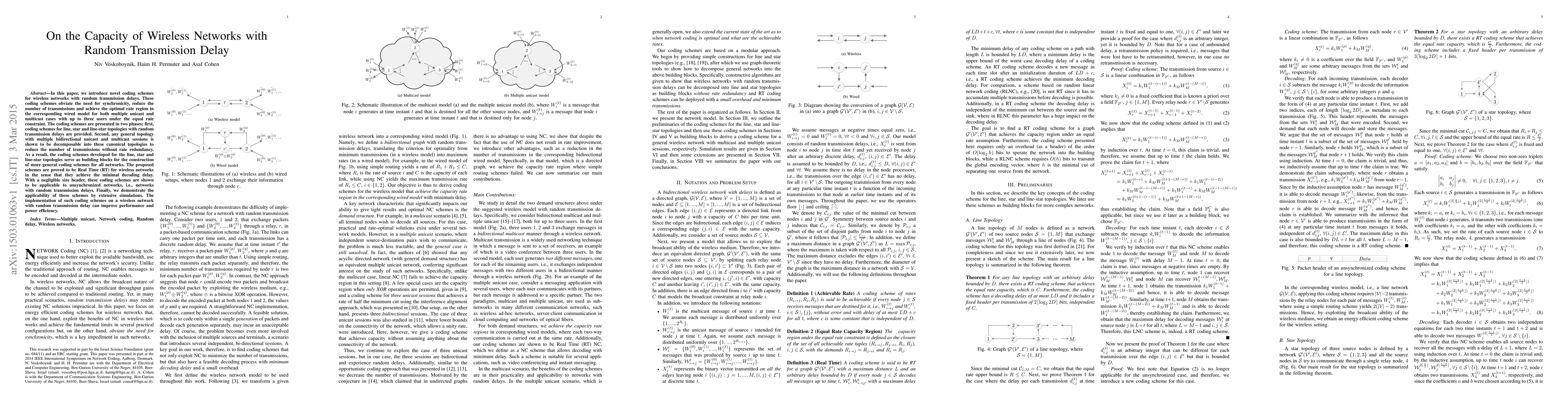 In this paper, we introduce novel coding schemes for wireless networks with random transmission delays. These coding schemes obviate the need for synchronicity, reduce the number of transmissions and achieve the optimal rate region in the corresponding wired model for both multiple unicast and multicast cases with up to three users under the equal rate constraint. The coding schemes are presented in two phases; first, coding schemes for line, star and line-star topologies with random transmission delays are provided. Second, any general topology with multiple bidirectional unicast and multicast sessions is shown to be decomposable into these canonical topologies to reduce the number of transmissions without rate redundancy. As a result, the coding schemes developed for the line, star and line-star topologies serve as building blocks for the construction of more general coding schemes for all networks. The proposed schemes are proved to be Real Time (RT) for wireless networks in the sense that they achieve the minimal decoding delay. With a negligible size header, these coding schemes are shown to be applicable to unsynchronized networks, i.e., networks with random transmission delays. Finally, we demonstrate the applicability of these schemes by extensive simulations. The implementation of such coding schemes on a wireless network with random transmission delay can improve performance and power efficiency.