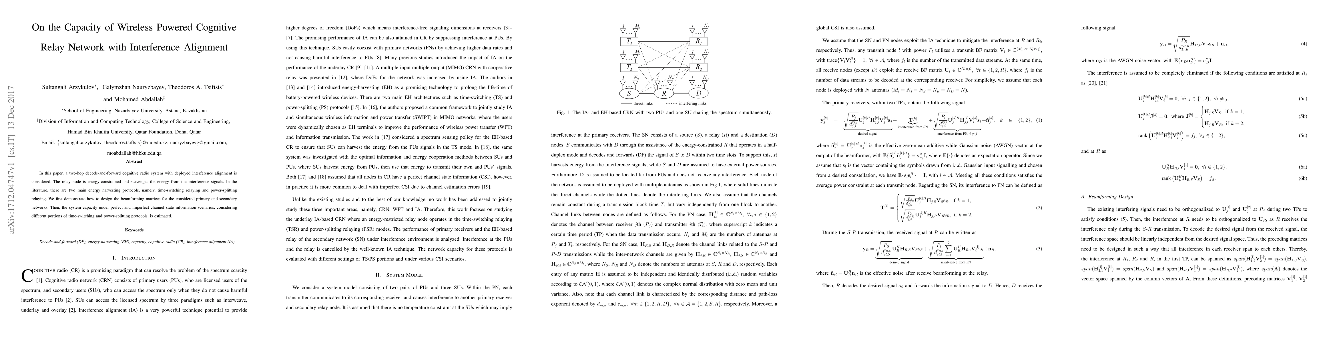 This paper investigates the capacity of a wireless powered cognitive relay network with interference alignment, focusing on energy-harvesting techniques in a two-hop decode-and-forward system. It evaluates system capacity under both perfect and imperfect channel state information, considering time-switching and power-splitting relaying protocols.