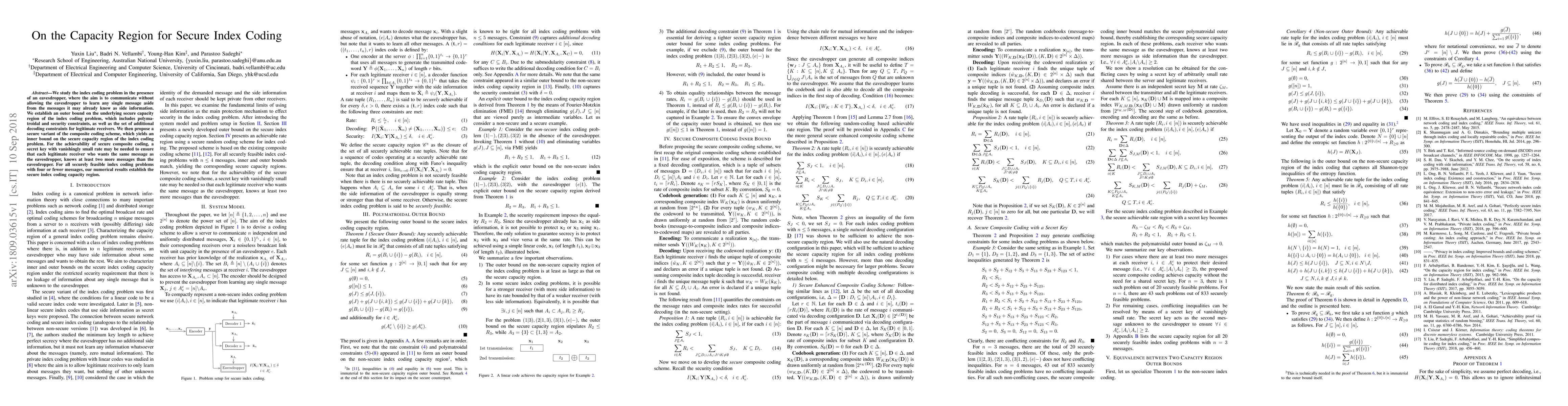 We study the index coding problem in the presence of an eavesdropper, where the aim is to communicate without allowing the eavesdropper to learn any single message aside from the messages it may already know as side information. We establish an outer bound on the underlying secure capacity region of the index coding problem, which includes polymatroidal and security constraints, as well as the set of additional decoding constraints for legitimate receivers. We then propose a secure variant of the composite coding scheme, which yields an inner bound on the secure capacity region of the index coding problem. For the achievability of secure composite coding, a secret key with vanishingly small rate may be needed to ensure that each legitimate receiver who wants the same message as the eavesdropper, knows at least two more messages than the eavesdropper. For all securely feasible index coding problems with four or fewer messages, our numerical results establish the secure index coding capacity region.