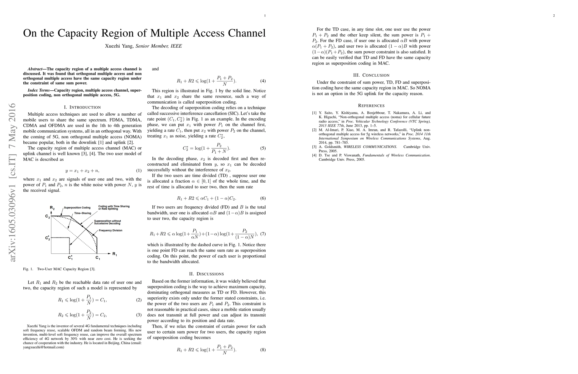 The capacity region of a multiple access channel is discussed. It was found that orthogonal multiple access and non orthogonal multiple access have the same capacity region under the constraint of same sum power.