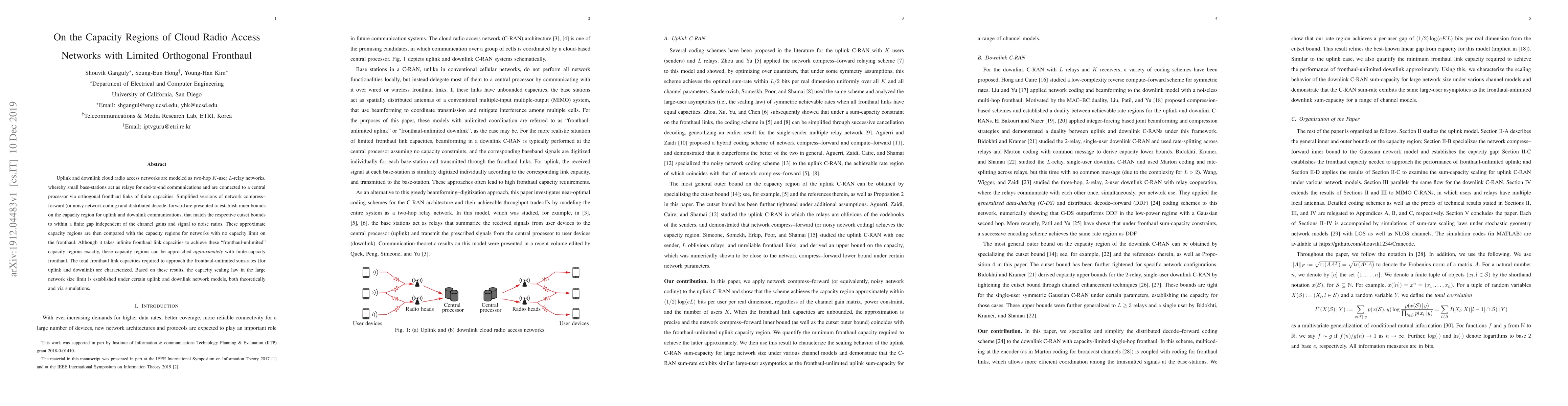 Uplink and downlink cloud radio access networks are modeled as two-hop K-user L-relay networks, whereby small base-stations act as relays for end-to-end communications and are connected to a central processor via orthogonal fronthaul links of finite capacities. Simplified versions of network compress-forward (or noisy network coding) and distributed decode-forward are presented to establish inner bounds on the capacity region for uplink and downlink communications, that match the respective cutset bounds to within a finite gap independent of the channel gains and signal to noise ratios. These approximate capacity regions are then compared with the capacity regions for networks with no capacity limit on the fronthaul. Although it takes infinite fronthaul link capacities to achieve these "fronthaul-unlimited" capacity regions exactly, these capacity regions can be approached approximately with finite-capacity fronthaul. The total fronthaul link capacities required to approach the fronthaul-unlimited sum-rates (for uplink and downlink) are characterized. Based on these results, the capacity scaling law in the large network size limit is established under certain uplink and downlink network models, both theoretically and via simulations.